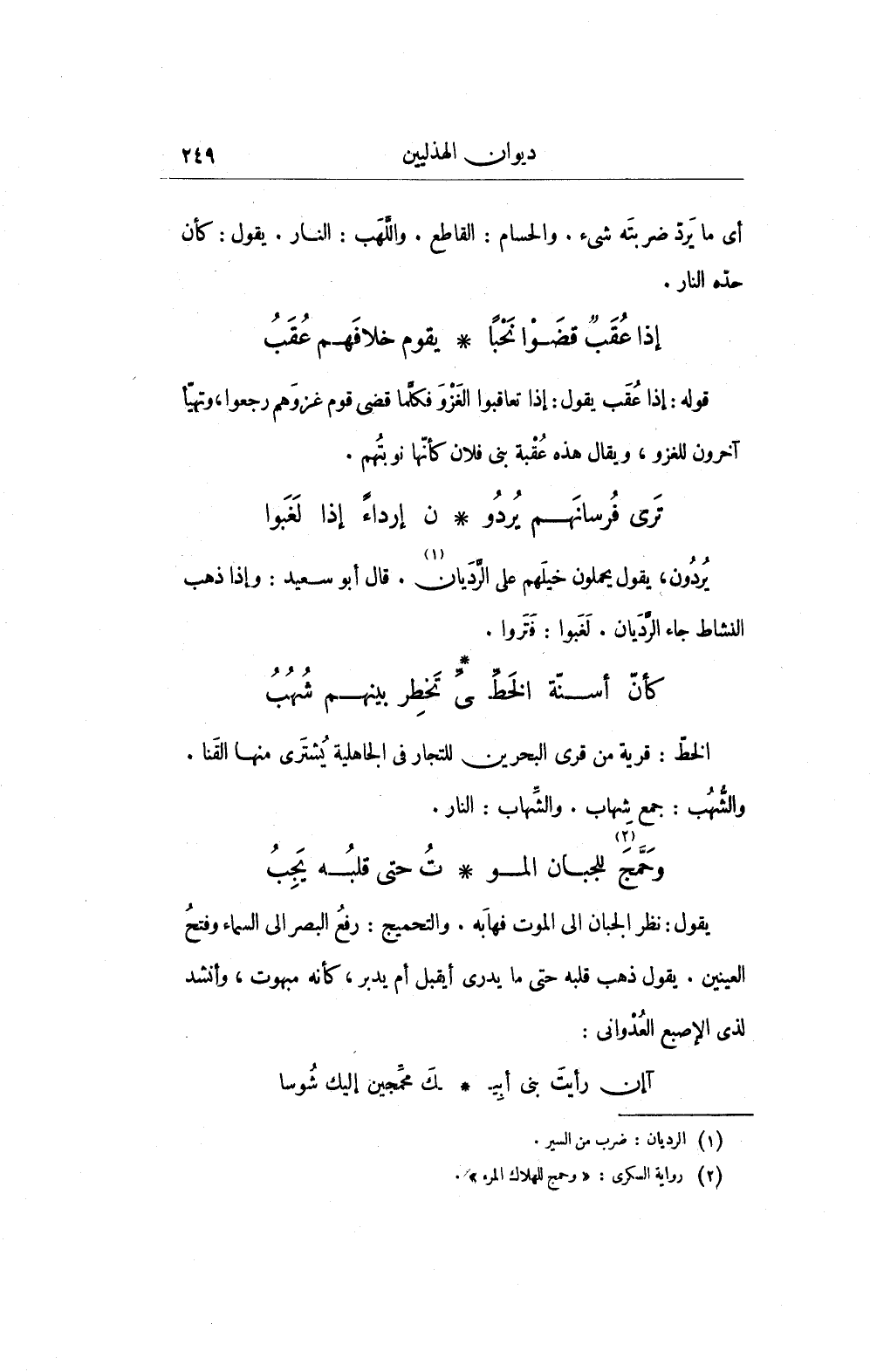 كأنّ أسنّة الخَطِّ ... ـىِّ تَخطِر بينهم شُهُبُ