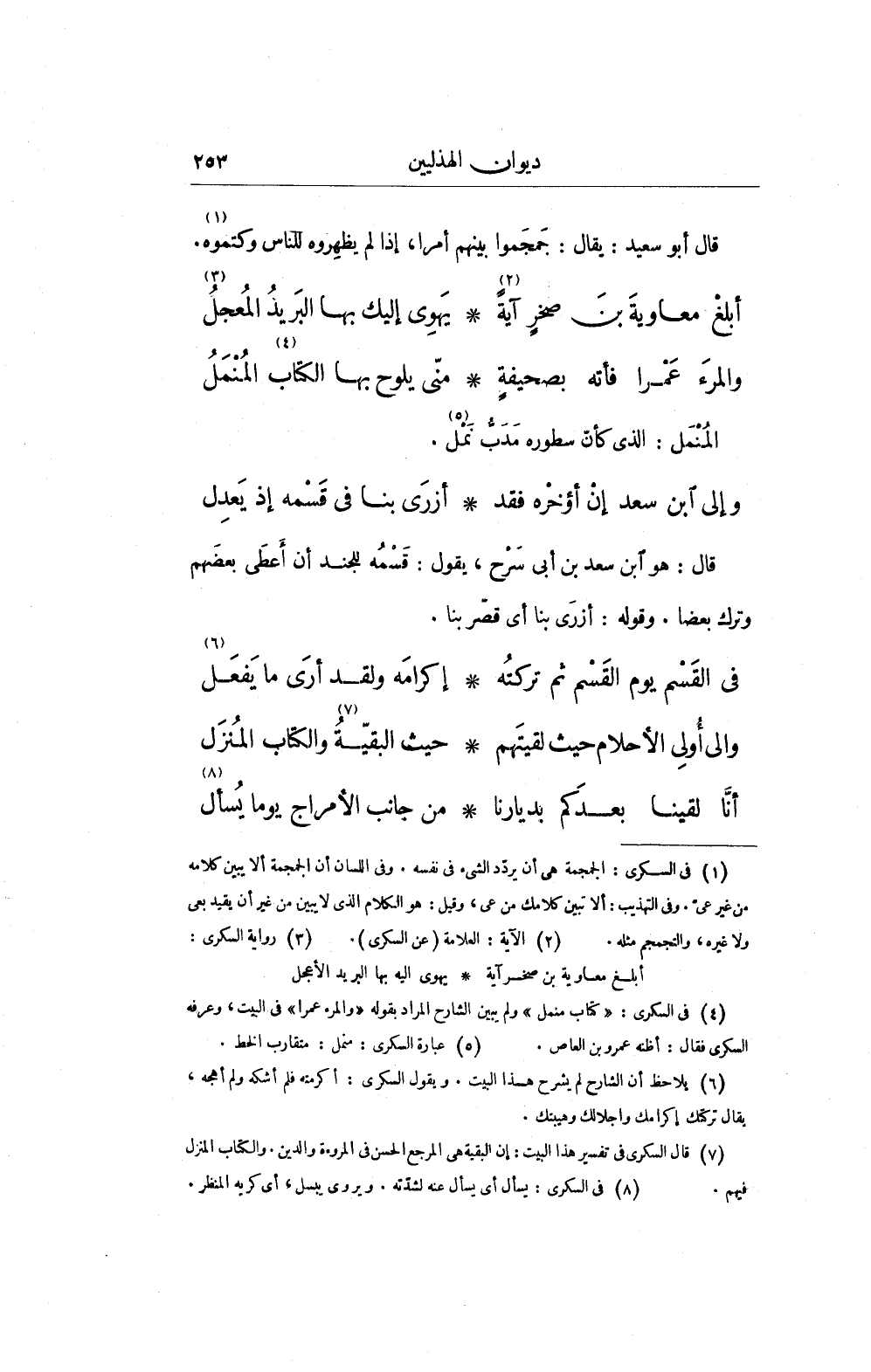 (¬7) قال السكرى في تفسير هذا البيت: إن البقية هي المرجع الحسن في المروءة والدين. والكتاب المنزل فيهم.