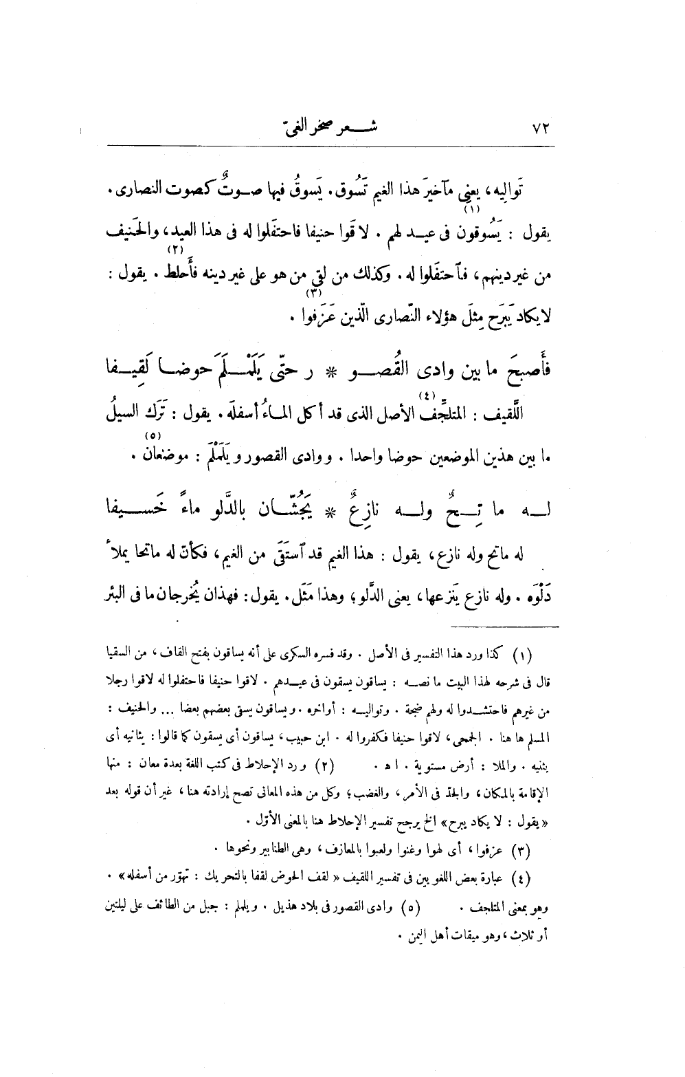 توالِيه، يعنِي مآخيرَ هذا الغيم تَسُوق. يَسوقُ فيها صوتٌ كصوت النصارى. يقول: يَسُوقون (¬1) في عيد لهم. لاقَوا حنيفا فاحتفَلوا له في هذا العيد، والحَنيف من غير دينهم، فاحتفَلوا له. وكذلك من لقى من هو على غير دينه فأَحلط (¬2). يقول: لا يكاد يَبرَحِ مِثلَ هؤلاء النّصارى الّذين عَزَفوا (¬3).