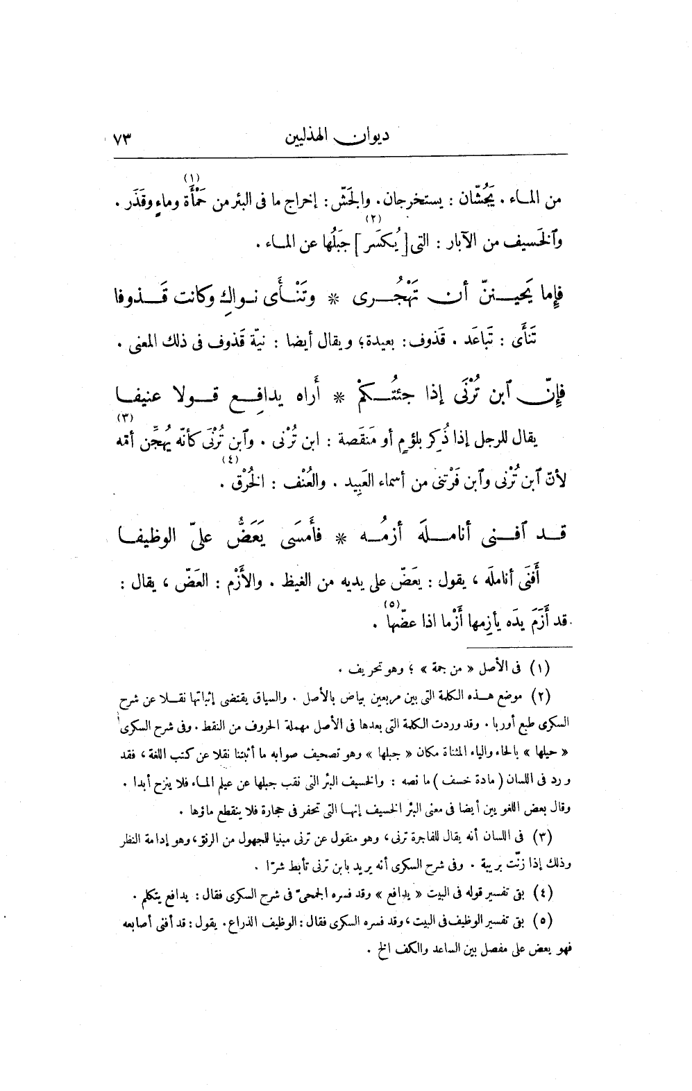 (¬2) موضع هذه الكلمة التي بين مربعين بياض بالأصل. والسياق يقتضى إثباتها نقلا عن شرح السكرى طبع أوربا. وقد وردت الكلمة التي بعدها في الأصل مهملة الحروف من النقط. وفي شرح السكرى "حيلها" بالحاء والياء المثناة مكان "جبلها"، وهو تصحيف صوابه ما أثبتنا نقلا عن كتب اللغة، فقد ورد في اللسان (مادة خسف) ما نصه: والخسيف البئر التى نقب جبلها عن عيلم الماء فلا ينزح أبدا. وقال بعض اللغويين أيضاً في معنى البئر الخسيف إنها التى تحفر فى حجارة فلا ينقطع ماؤها.
