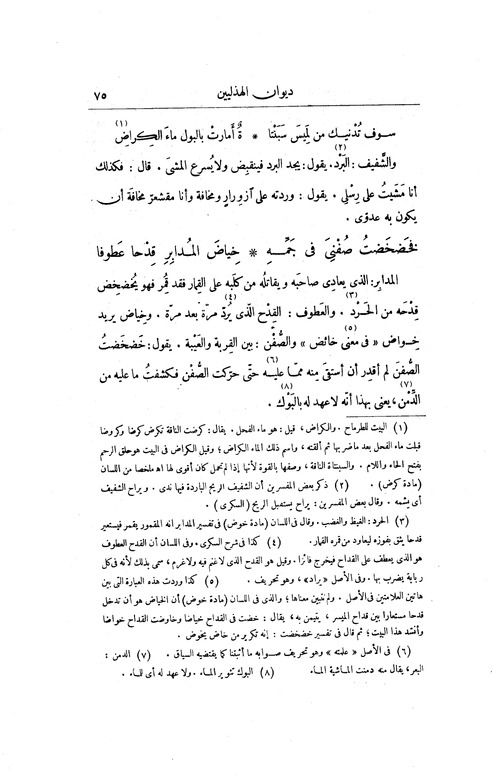 المدابِر: الذي يعادِى صاحبَه ويقاتلُه من كلَبه على القِمار فقد قُمِر فهو يُخضخِض قِدْحَه من الحَرْد (¬3). والعَطوف: القِدْح الّذى يردّ (¬4) مرّة بعد مرّة. وخِياض يريد خِواض "في معنى (¬5) خائض" والصُّفْن: بين القِربة والعَيْبة. يقول: خَضخَضتُ الصُّفنَ لم أقدِر أن أستقىَ منِه مما عليه (¬6) حتّى حرّكت الصُّفْن. فكشفتُ ما عليه من الدِّمْن (¬7)، يعني بهذا أنّه لا عهد له بالبَوْك (¬8).