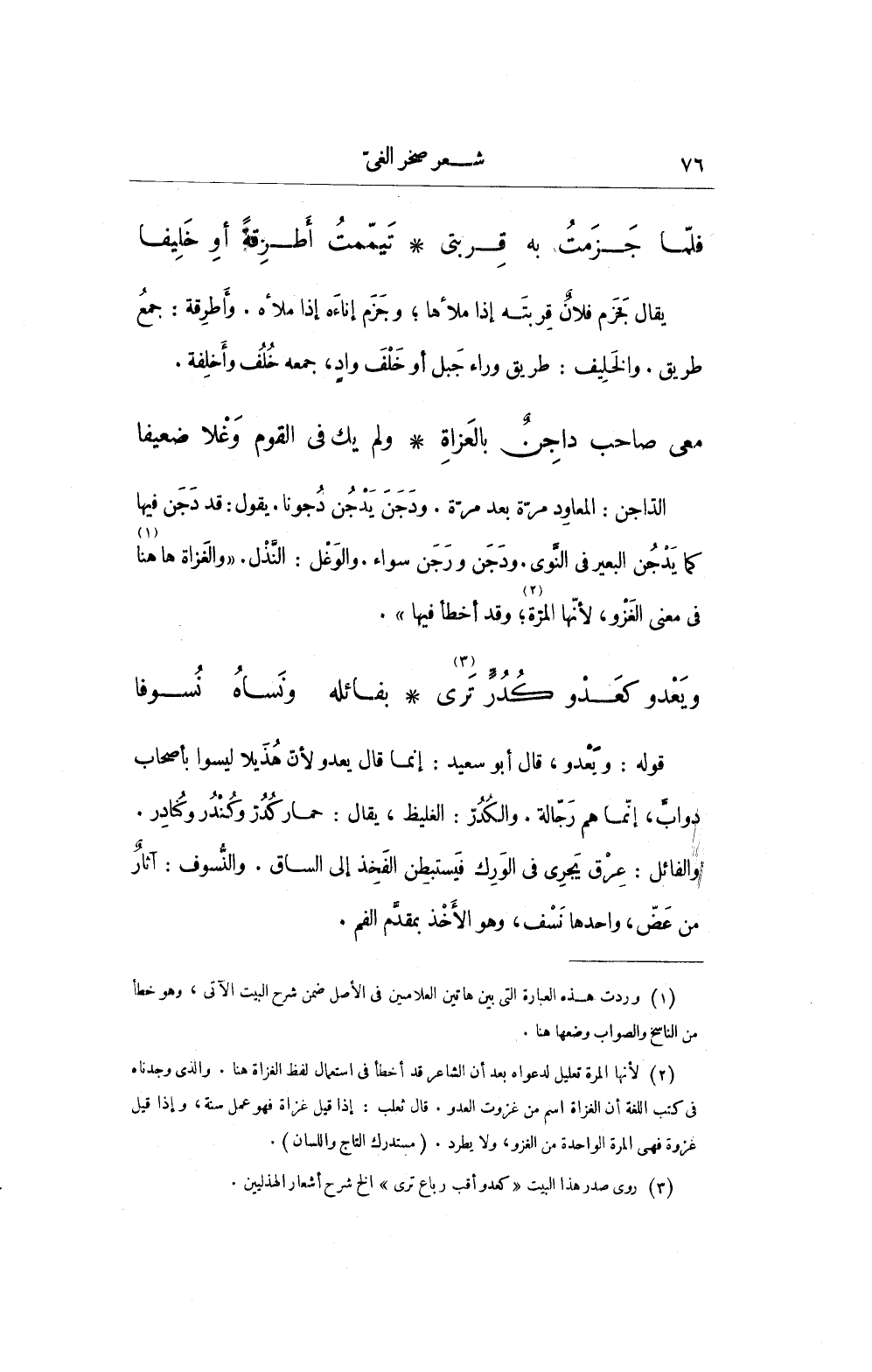 (¬2) لأنها المرة تعليل لدعواه بعد أن الشاعر قد أخطأ في استعمال لفظ الغزاة هنا. والذي وجدناه في كتب اللغة أن الغزاة اسم من غزوت العدو. قال ثعلب: إذا قيل غزاة فهو عمل سنة، وإذا قيل غزوة فهى المرة الواحدة من الغزو، ولا يطرد. (مستدرك التاج واللسان).