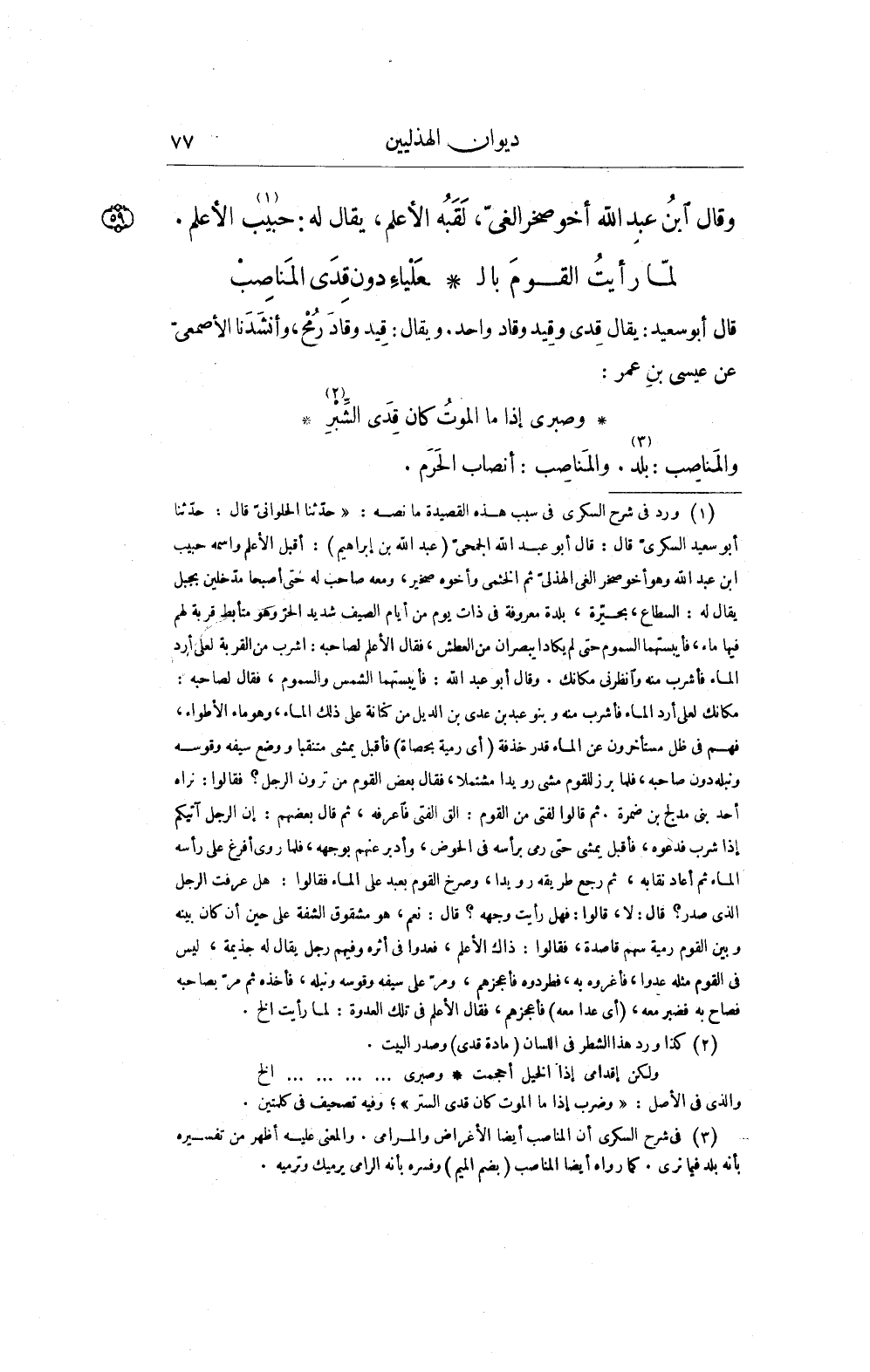 (¬3) في شرح السكرى أن المناصب أيضا الأغراض والمرامى. والمعنى عليه أظهر من تفسيره بأنه بلد فيما نرى. كما رواء أيضا المناصب (بضم الميم) وفسره بأنه الرامى يرميك وترميه.