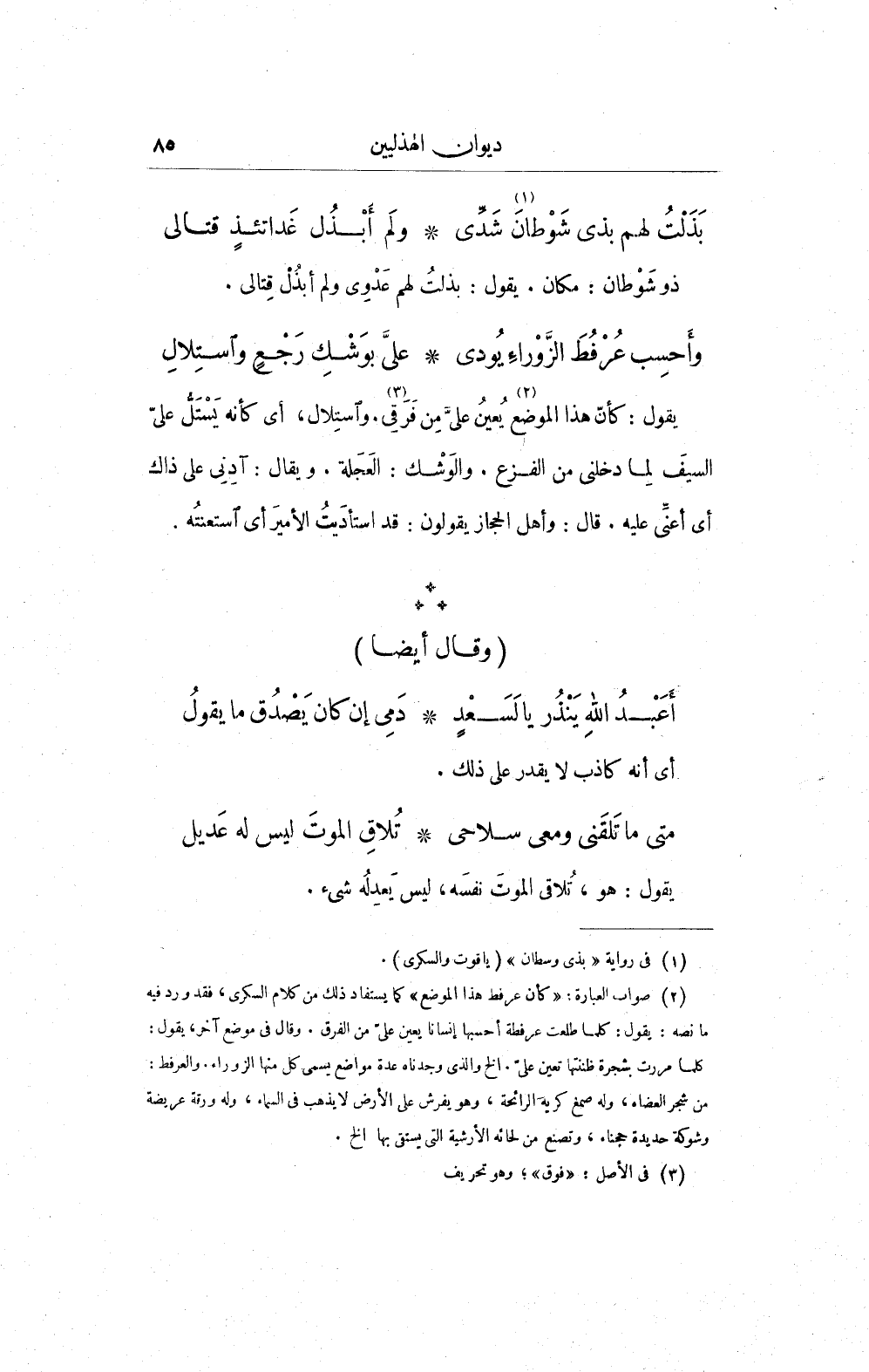(¬2) صواب العبارة: "كأن عرفط هذا الموضع" كما يستفاد ذلك من كلام السكرى، فقد ورد فيه ما نصه: يقول: كلما طلعت عرفطة أحسبها إنسانا يعين عليّ من الفرق. وقال في موضع أخر، يقول: كلما مررت بشجرة ظننتها تعين علىّ. الخ والذي وجدناه عدة مواضع يسمى كل منها الزوراء. والعرفط: من شجر العضاه، وله صمغ كريه الرائحة، وهو يفرش على الأرض لا يذهب في السماء، وله ورقة عريضة وشوكة حديدة حجناء, وتصنع من لحائه الأرشبة التي يستقى بها الخ.