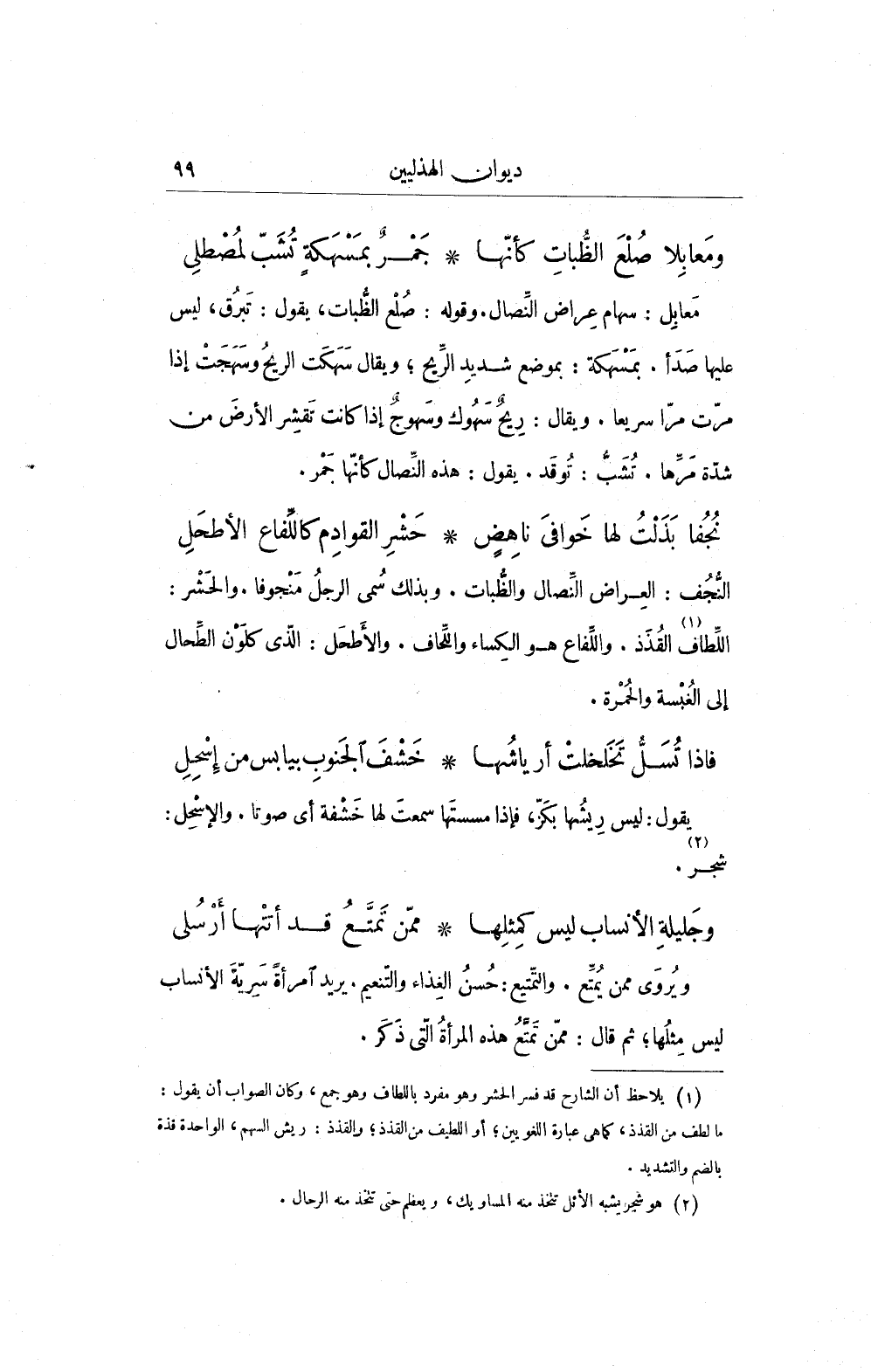 (¬1) يلاحظ أن الشارح قد فسر الحشر وهو مفرد باللطاف وهو جمع، وكان الصواب أن يقول: ما لطف من القذذ، كما هي عبارة اللغويين؛ أو اللطيف من القذذ؛ والقذذ: ريش السهم، الواحدة فذة بالضم والتشديد.