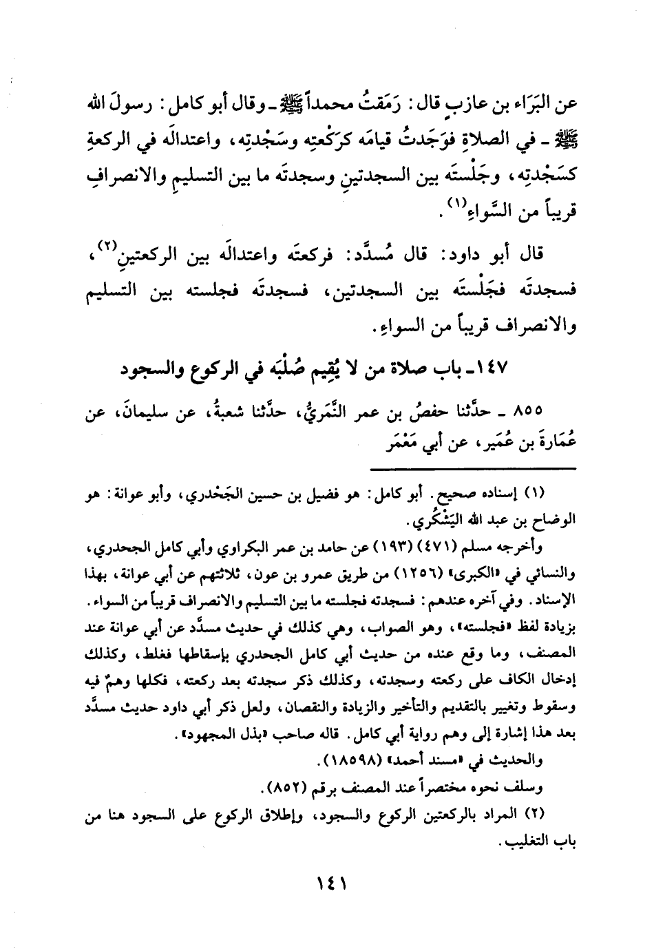 قال أبو داود: قال مُسدَد: فركعتَه واعتدالَه بين الركعتينِ (¬٢)، فسجدتَه فجَلستَه بين السجدتين، فسجدتَه فجلسته بين التسليم والانصراف قريباً من السواء.