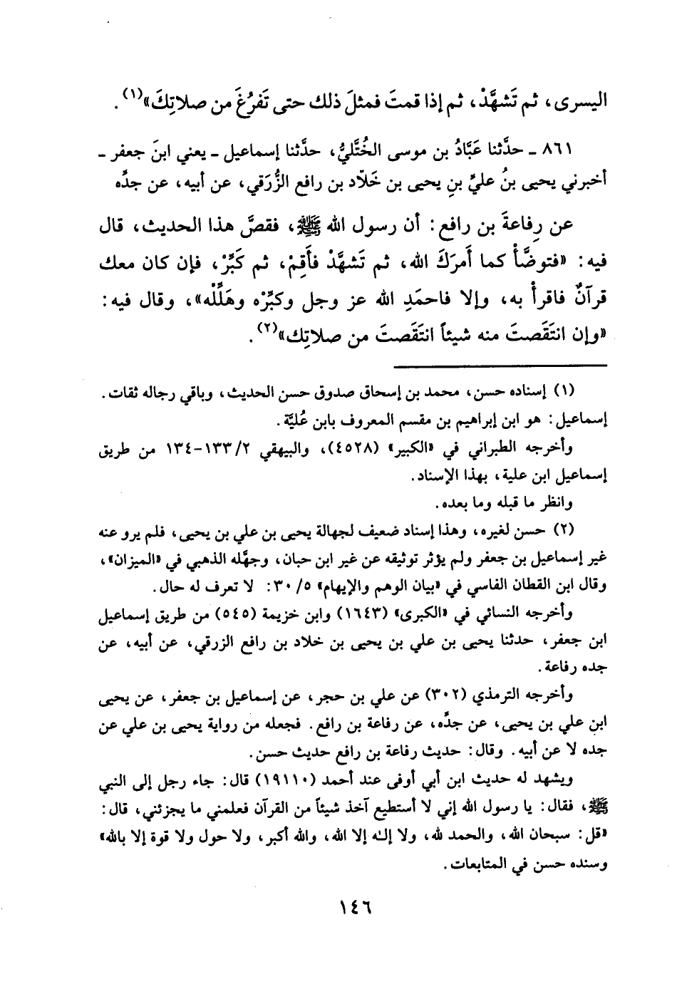٨٦١ - حدثنا عَبَّادُ بن موسى الخُتَّليُّ، حدثنا إسماعيل - يعني ابنَ جعفر- أخبرني يحيى بنُ عليِّ بنِ يحيي بن خَلّاد بن رافع الزُّرَقي، عن أبيه، عن جده عن رِفاعةَ بن رافع: أن رسول الله- صلى الله عليه وسلم -ِ، فقصَّ هذا الحديث، قال فيه: "فتوضأ كما أَمرَكَ الله، ثم تَشهَّد فأقِم، ثم كَبِّرْ، فإن كان معك قرآن فاقرأْ به، وإلا فاحمَدِ الله عز وجل وكبرْه وهَلله", وقال فيه: "وإن انتَقَصتَ منه شيئاً انتَقَصتَ من صلاتِك" (¬٢).