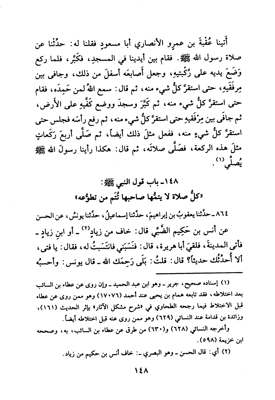 أَتينا عُقبةَ بن عمرِو الأنصاري أبا مسعودٍ فقلنا له: حدثْنا عن صلاة رسول الله- صلى الله عليه وسلم -. فقام بين أيدينا في المسجدِ، فكبّر، فلما ركع وَضَعَ يديه على رُكبتيهِ، وجعل أَصابعَه أسفلَ من ذلك، وجافى بين مِرفقَيهِ، حتى استقرَّ كل شيء منه، ثم قال: سمع اللهُ لمن حَمِدَه، فقام حتى استقرّ كل شيء منه، ثم كَبّرَ وسجدَ ووضع كَفيهِ على الأَرض، ثم جافَى بين مِرفَقيهِ حتى استقرَّ كل شيء منه، ثم رفع رأسَه فجلس حتى استقر كل شيءٍ منه، ففعل مثلَ ذلك أيضاً، ثم صَلى أربعَ رَكعاتِ مثلَ هذه الركعة، فصَلّى صلاتَه، ثم قال: هكذا رأينا رسولَ الله- صلى الله عليه وسلم - يُصلّي (¬١).