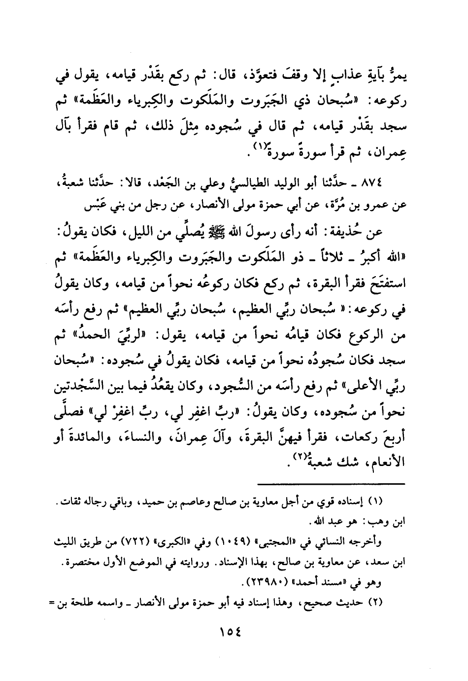 سجد فكان سُجوده نحواً من قيامه، فكان يقولُ في سُجوده: "سُبحان ربي الأعلى" ثم رفع رأسَه من السُّجود، وكان يقعُدُ فيما بين السَّجْدتين نحواً من سُجوده، وكان يقولُ: "رب اغفِر لي، ربً أغفِرْ لي" فصلَّى أربعَ ركعات، فقرأ فيهن البقرةَ، وآلَ عِمرانَ، والنساء" والمائدةَ أو الأنعام، شك شعبةُ (¬٢).