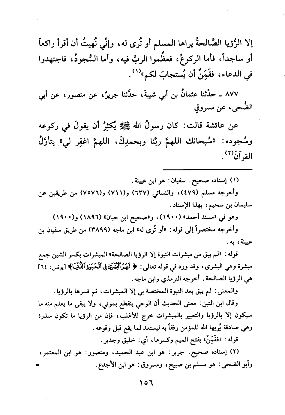 ٨٧٧ - حدثنا عثمانُ بن أبي شيبةَ، حدَثنا جرير، عن منصور، عن أبي الضحى، عن مسروقٍ عن عائشة قالت: كان رسولُ الله - صلى الله عليه وسلم - يكثِرُ أن يقولَ في ركوعه وسُجوده: "سُبحانك اللهم ربنا وبحمدِكَ، اللهم اغفِر لي" يتأوَّلُ القرآنَ (¬٢).