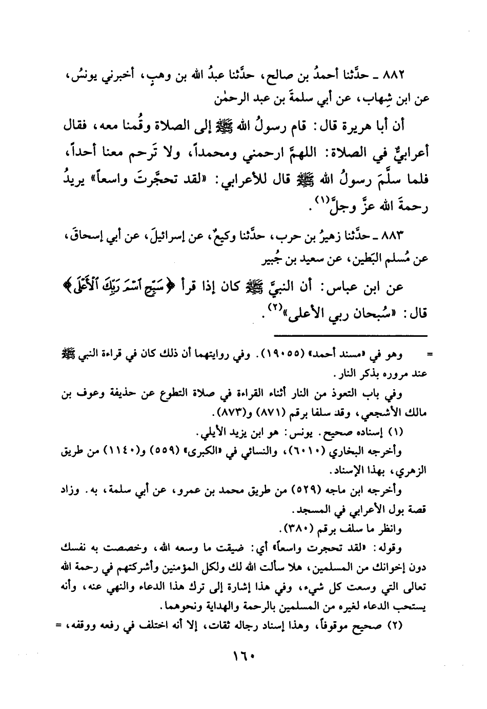 أن أبا هريرة قال: قام رسولُ الله- صلى الله عليه وسلم -إلى الصلاة وقُمنا معه، فقال أعرابيٌّ في الصلاة: اللهم ارحمني ومحمداً، ولا تَرحم معنا أحداً، فلما سلمَ رسولُ الله- صلى الله عليه وسلم -قال للأعرابي: "لقد تحجرتَ واسعاً" يريدُ رحمةَ الله عزَ وجل (¬١).