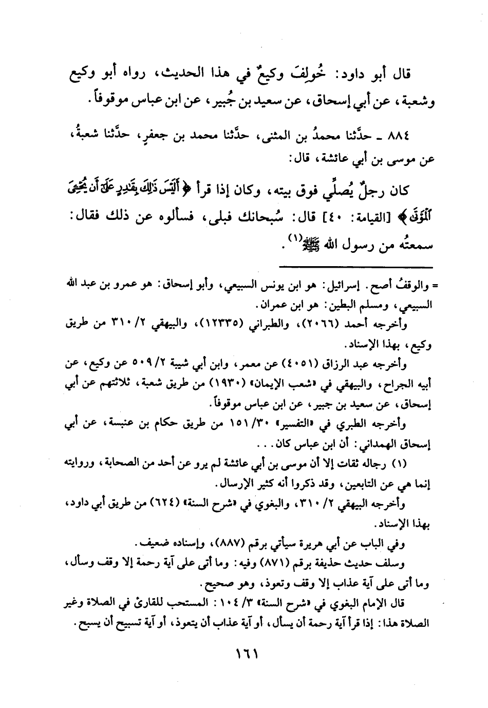كان رجلٌ يُصلي فوق بيته، وكان إذا قرأ {أَلَيْسَ ذَلِكَ بِقَادِرٍ عَلَى أَنْ يُحْيِيَ الْمَوْتَى (٤٠)} [القيامة: ٤٠] قال: سُبحانك فبلى، فسألوه عن ذلك فقال: سمعتُه من رسول الله - صلى الله عليه وسلم - (¬١).