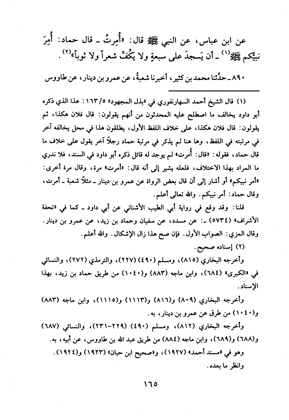 عن ابن عباس، عن النبي- صلى الله عليه وسلم - قال: "أُمِرتُ- قال حماد: أُمِرَ نبيكم - صلى الله عليه وسلم- (¬١) أن يَسجدَ على سبعةٍ ولا يكُفَّ شعرًا ولا ثوبًا " (¬٢).