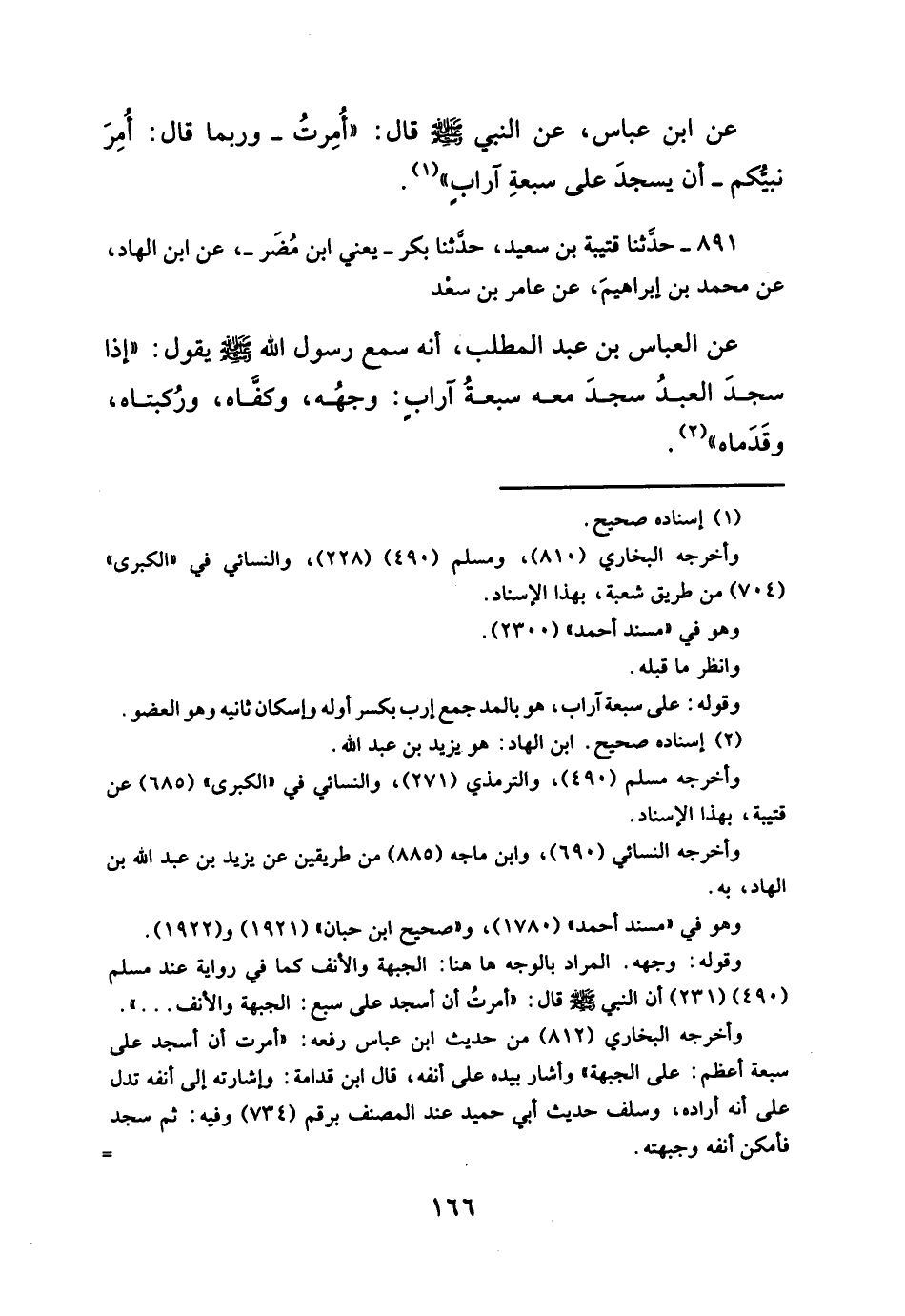 عن العباس بن عبد المطلب، أنه سمع رسول الله- صلى الله عليه وسلم -يقول: "إذا سجدَ العبدُ سجدَ معه سبعةُ آرابٍ: وجهُه، وكفَّاه، ورُكبتاه، وقَدَماه" (¬٢).