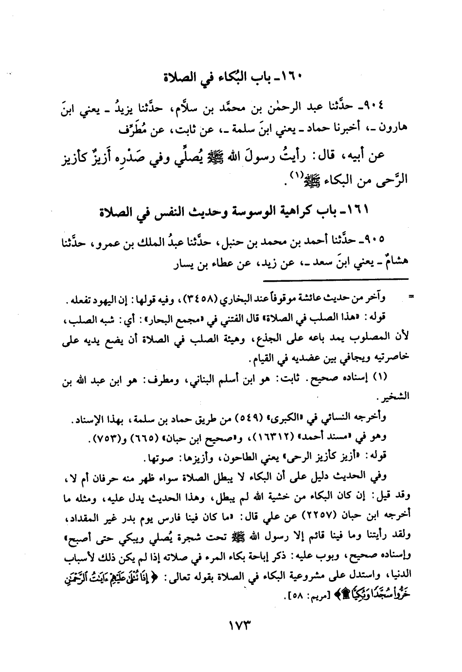 وإسناده صحيح، وبوب عليه: ذكر إباحة بكاء المرء في صلاته إذا لم يكن ذلك لأسباب