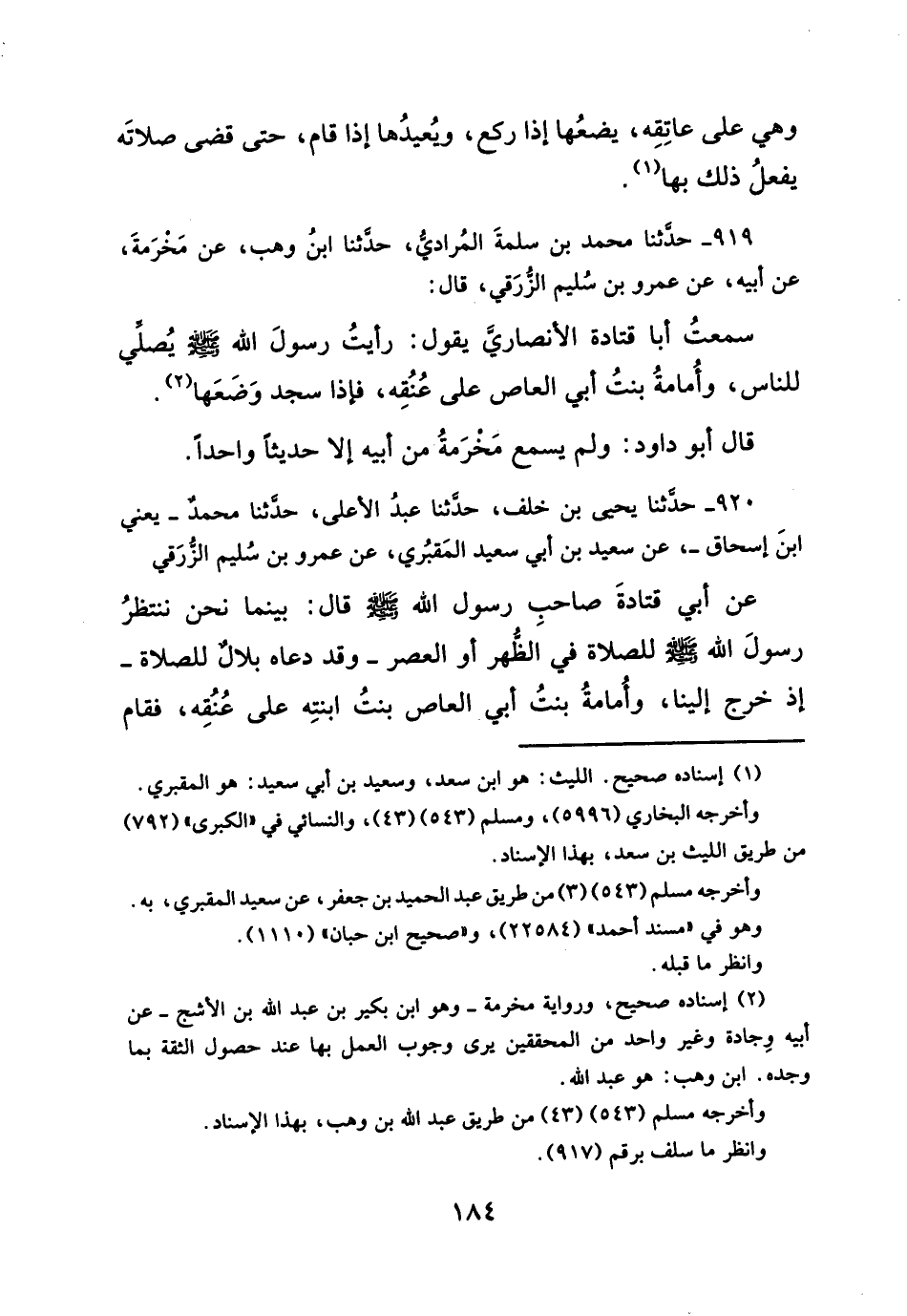 سمعتُ أبا قتادة الأنصاريَّ يقول: رأيتُ رسولَ الله- صلى الله عليه وسلم - يُصلّي للناس، وأُمامةُ بنتُ أبي العاص على عُنُقِه، فإذا سجد وَضَعَها (¬٢).
