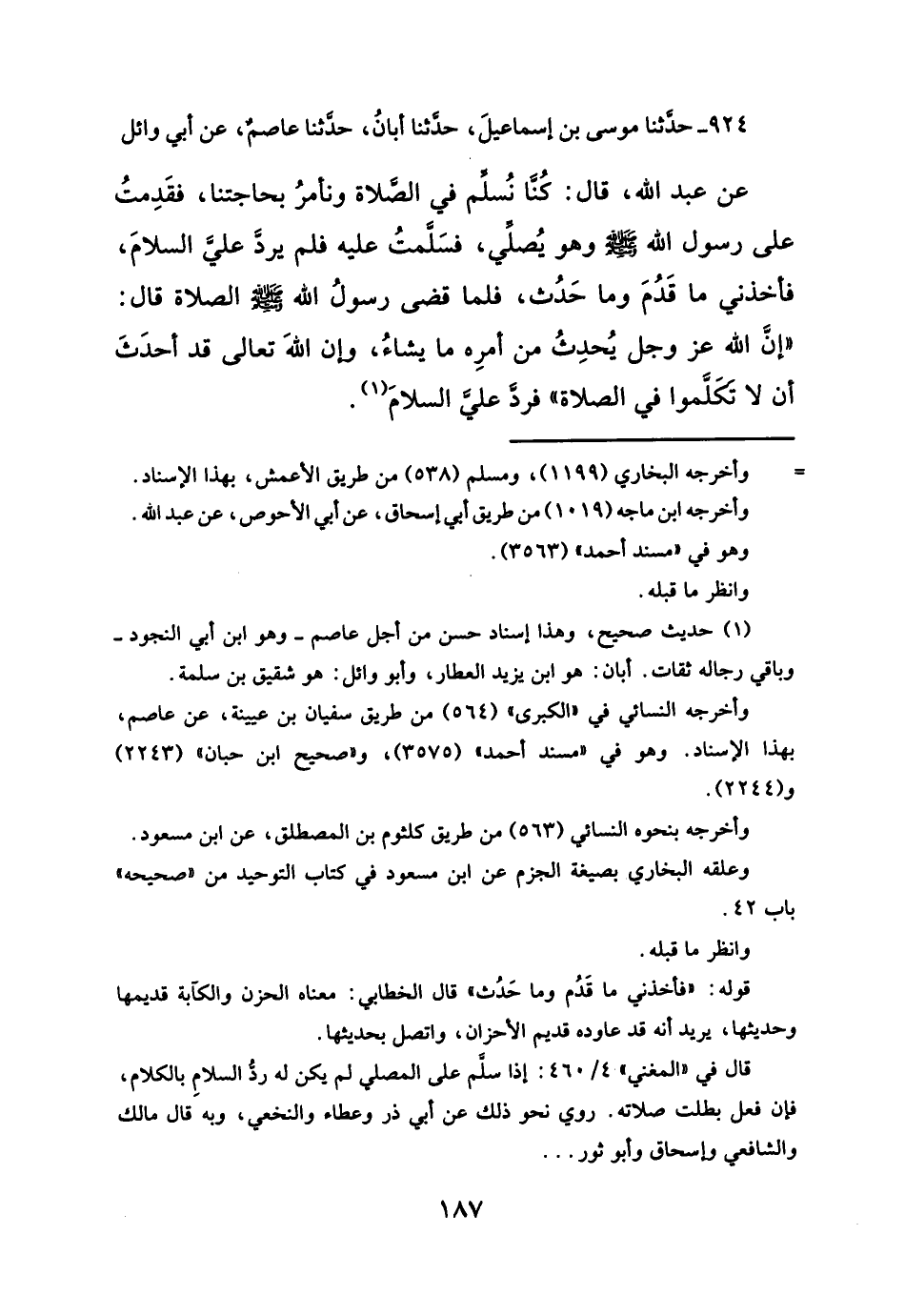 ٩٢٤ - حدثنا موسى بن اسماعيلَ، حدثنا أبانُ، حدثنا عاصم، عن أبي وائل عن عبد الله، قال: كنا نُسلم في الصلاة ونأمرُ بحاجتنا، فقَدِمتُ على رسول الله- صلى الله عليه وسلم -وهو يُصلّي، فسَلمتُ عليه فلم يردَّ عليّ السلامَ،