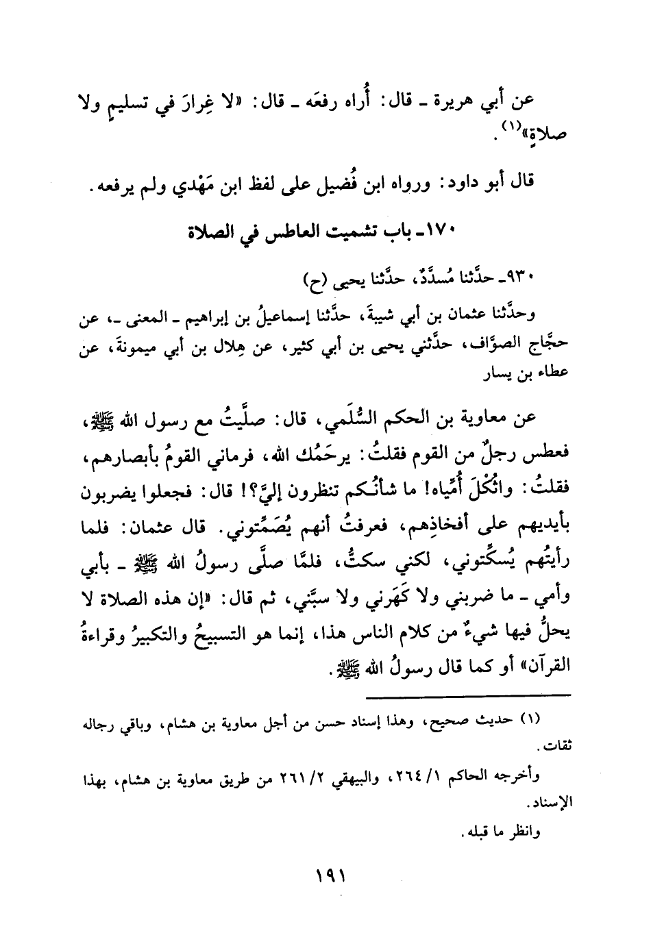 عن معاوية بن الحكم السلَمي، قال: صلَّيتُ مع رسول الله- صلى الله عليه وسلم -، فعطس رجل من القوم فقلتُ: يرحَمُك الله، فرماني القومُ بأبصارهم، فقلتُ: واثُكْلَ أُمِّياه! ما شأنُكم تنظرون إليَّ؟! قال: فجعلوا يضربون بأيديهم على أفخاذهم، فعرفتُ أنهم يُصَمِّتوني. قال عثمان: فلما رأيتُهم يُسكتوني، لكني سكت، فلما صلَى رسولُ الله- صلى الله عليه وسلم - بأبي وأمي- ما ضربني ولا كَهَرني ولا سبَّني، ثم قال: "إن هذه الصلاة لا يحلُّ فيها شيءٌ من كلام الناس هذا، إنما هو التسبيحُ والتكبيرُ وقراءةُ القرآن" أو كما قال رسولُ الله- صلى الله عليه وسلم -.
