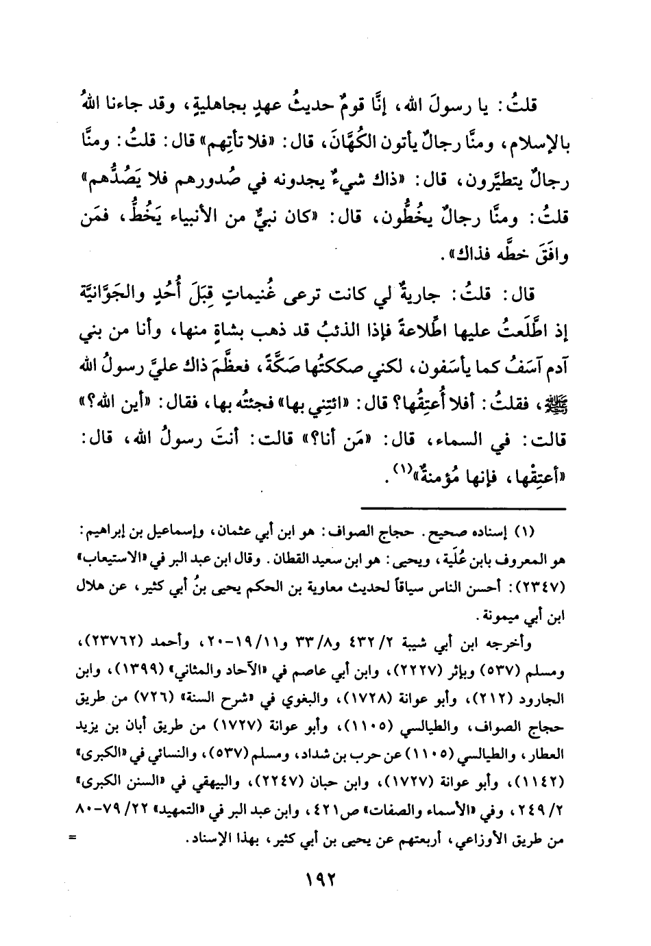 قال: قلتُ: جاريةٌ لي كانت ترعى غُنيماتِ قِبَلَ أُحُدٍ والجَوَّانيَّة إذ اطَّلَعتُ عليها اطلاعةَ فإذا الذئبُ قد ذهب بشاهِ منها، وأنا من بني آدم آسَفُ كما يأسَفون، لكني صككتُها صَكَّةَ، فعظَّمَ ذاك على رسولُ الله - صلى الله عليه وسلم -، فقلتُ: أفلا أُعتِقُها؟ قال: "ائتِني بها" فجئتُه بها، فقال: "أين الله؟ " قالت: في السماء، قال: "مَن أنا؟ " قالت: أنتَ رسولُ الله، قال: