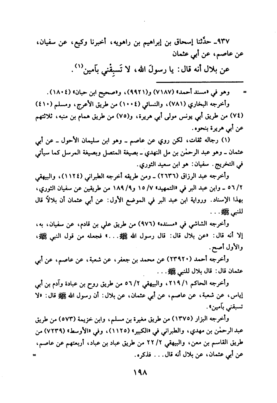 ٩٣٧ - حدثنا إسحاق بن إبراهيم بن راهويه، أخبرنا وكيع، عن سفيان، عن عاصم، عن أبي عثمان