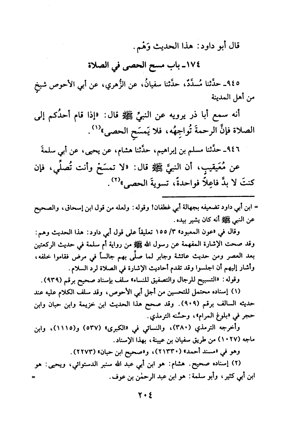 ٩٤٦ - حدثنا مسلم بن إبراهيم، حدثنا هشام، عن يحيي، عن أبي سلمةَ عن مُعَيقيبٍ، أن النبي- صلى الله عليه وسلم -قال: "لا تمسَحْ وأنت تُصلّي، فإن كنتَ لا بدَّ فاعِلًا فواحدةً، تسويةَ الحصى" (¬٢).