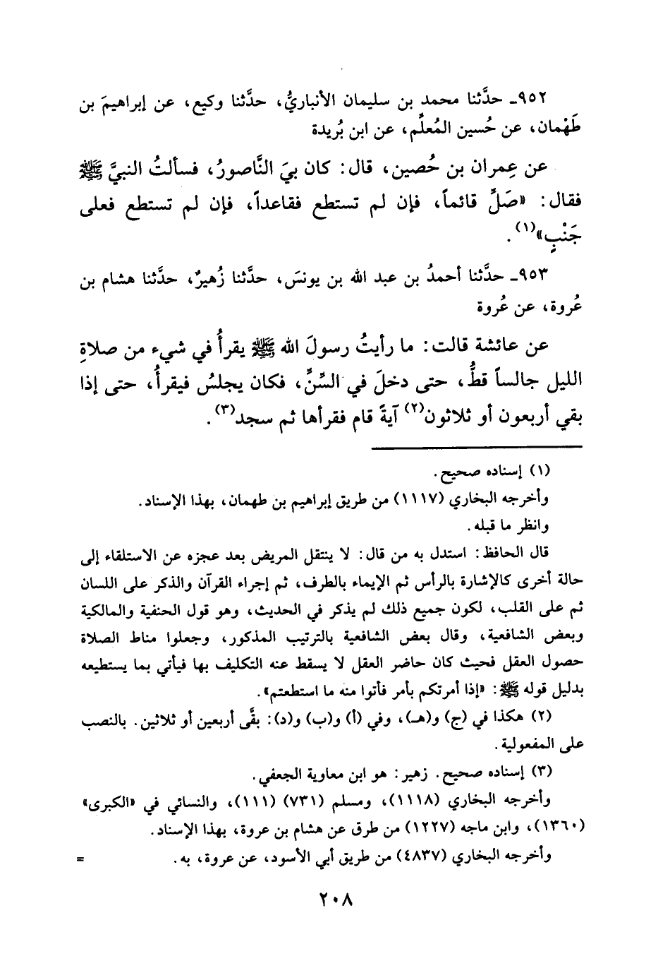 ٩٥٣ - حدَثنا أحمدُ بن عبد الله بن يونسَ، حدثنا زُهير، حدَثنا هشام بن عُروة، عن عُروة عن عائشة قالت: ما رأيتُ رسولَ الله- صلى الله عليه وسلم -يقرأُ في شيء من صلاةِ الليل جالساً قط، حتى دخلَ في السِّنِّ، فكان يجلسُ فيقرأُ، حتى إذا بقي أربعون أو ثلاثون (¬٢) آيةَ قَام فقرأها ثم سجد (¬٣).