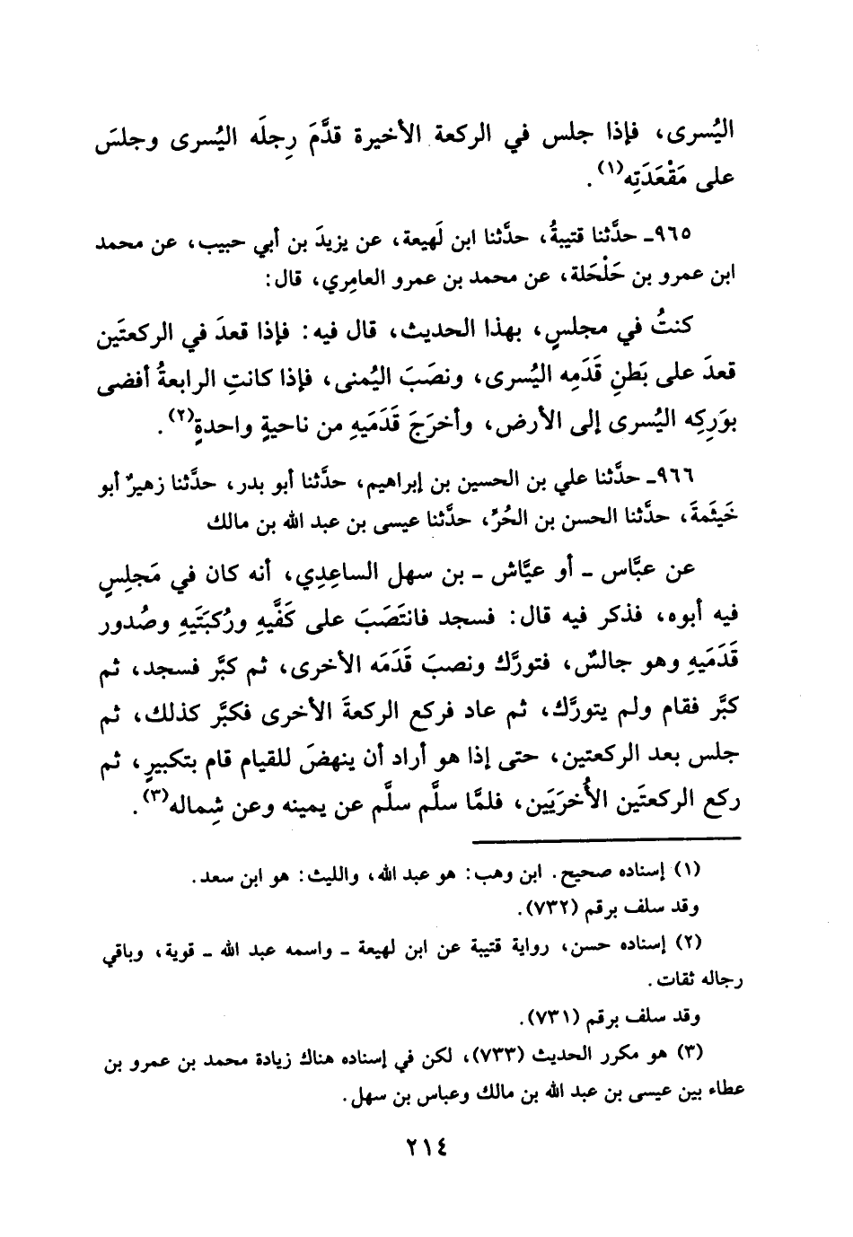 عن عبّاس- أو عيّاش- بن سهل الساعِدِي، أنه كان في مَجلِسٍ فيه أبوه، فذكر فيه قال: فسجد فانتَصَبَ على كفيهِ ورُكبَتَيهِ وصُدور قَدَمَيهِ وهو جالس، فتورَّك ونصبَ قَدَمَه الأخرى، ثم كبّر فسجد، ثم كبر فقام ولم يتورَّك، ثم عاد فركع الركعةَ الأخرى فكبّر كذلك، ثم جلس بعد الركعتين، حتى إذا هو أراد أن ينهضَ للقيام قام بتكبيرٍ، ثم ركع الركعتَين الأُخرَيَين، فلمّا سلّم سلّم عن يمينه وعن شِماله (¬٣).