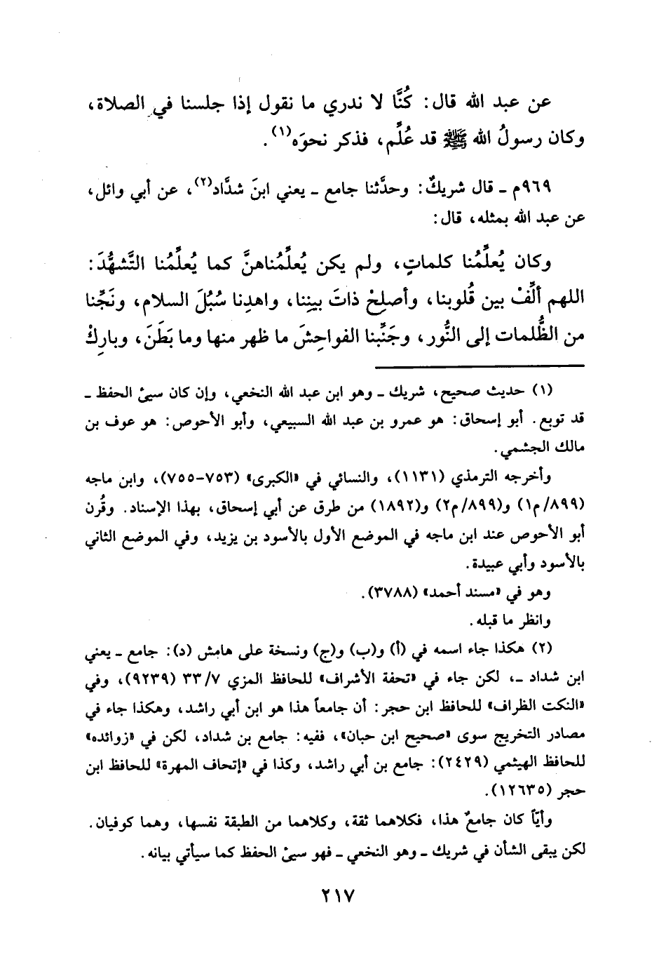 ٩٦٩ م- قال شريك: وحدثنا جامع- يعني ابنَ شداد (¬٢)، عن أبي وائل، عن عبد الله بمثله، قال: