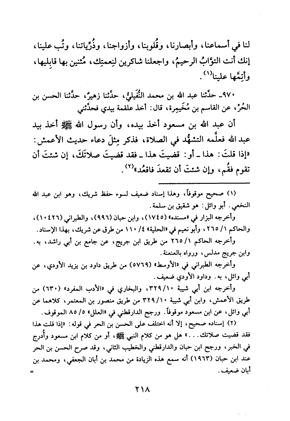 فقد قضيت صلاتك ... " هل هو من كلام النبي - صلى الله عليه وسلم -، أو من كلام ابن مسعود وأُدرج في الخبر، ورجح ابن حبان والدارقطني والخطيب الثاني، وقد صرح الحسن بن الحر عند ابن حبان (١٩٦٣) أنه سمع هذه الزيادة من محمد بن أبان الجعفي، ومحمد بن أبان ضعيف. =