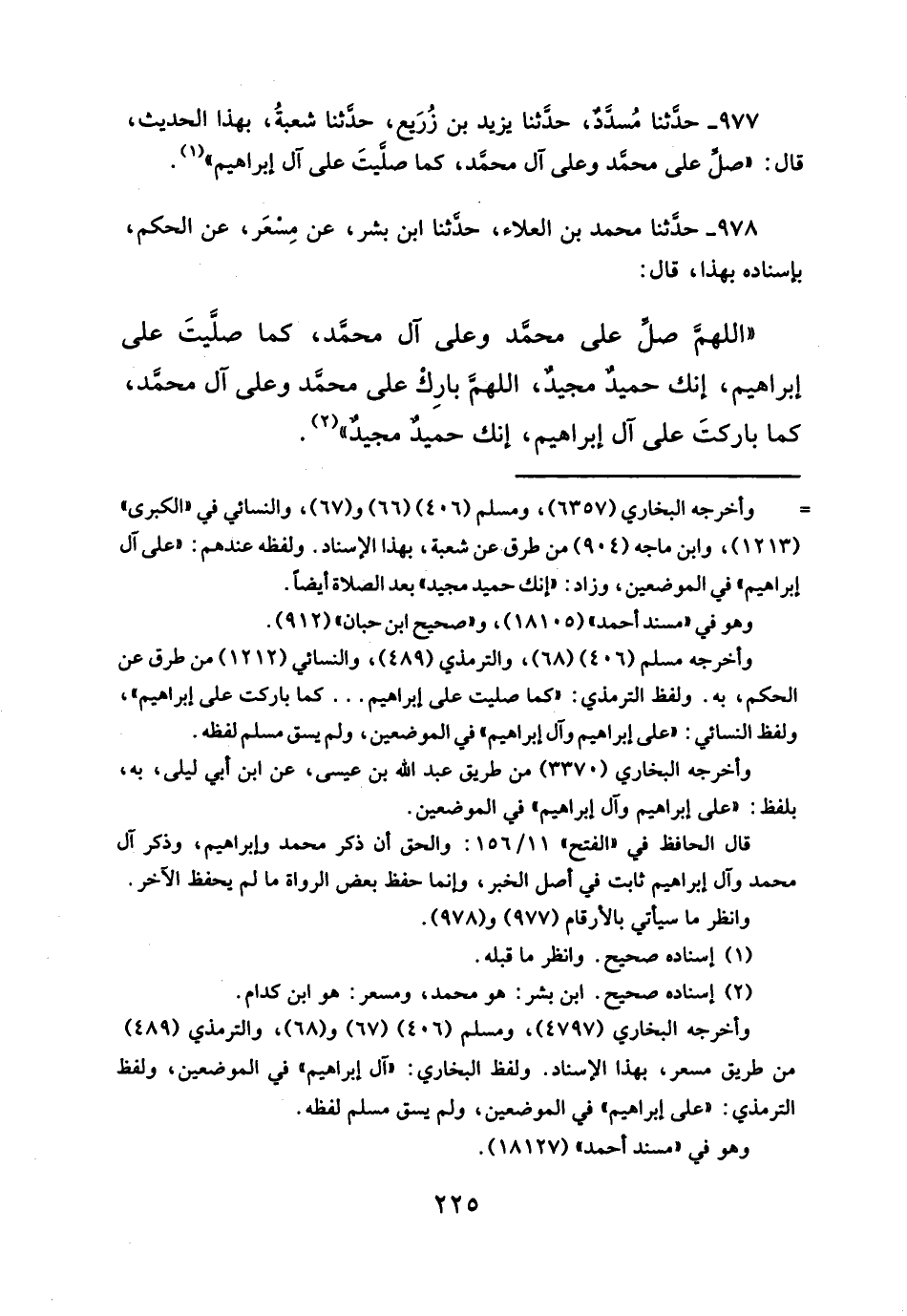 ٩٧٧ - حدثنا مُسدَّد، حدَثنا يزيد بن زُرَيع، حدثنا شعبةُ، بهذا الحديث، قال: "صل على محمّد وعلى آل محمَّد، كما صلّيتَ على آل إبراهيم" (¬١).