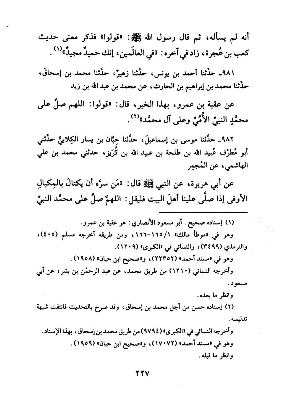 ٩٨١ - حدثنا أحمد بن يونس، حدّثنا زهيرٌ، حدثنا محمد بن إسحاقَ، حدَثنا محمد بن إبراهيم بن الحارث، عن محمد بن عبد الله بن زيد عن عقبة بن عمرو، بهذا الخبر، قال: "قولوا: اللهم صل على محمدِ النبيِّ الأُميّ وعلى آل محمَّد" (¬٢).