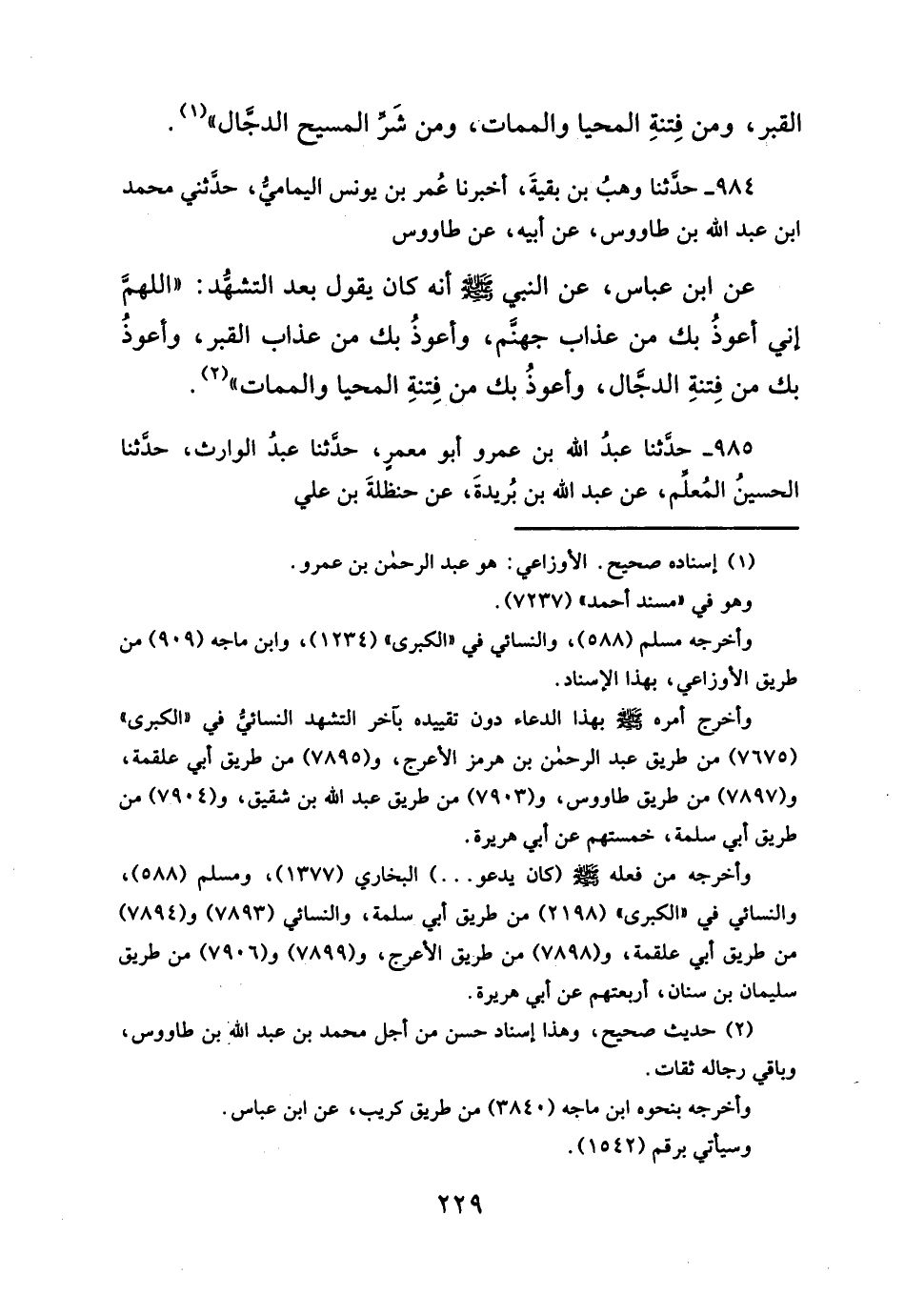 عن ابن عباس، عن النبي- صلى الله عليه وسلم -أنه كان يقول بعد التشهُّد: "اللهمَّ إني أعوذُ بك من عذاب جهنَم، وأعوذُ بك من عذاب القبر، وأعوذُ بك من فِتنةِ الدجَّال، وأعوذُ بك من فِتنةِ المحيا والممات" (¬٢).