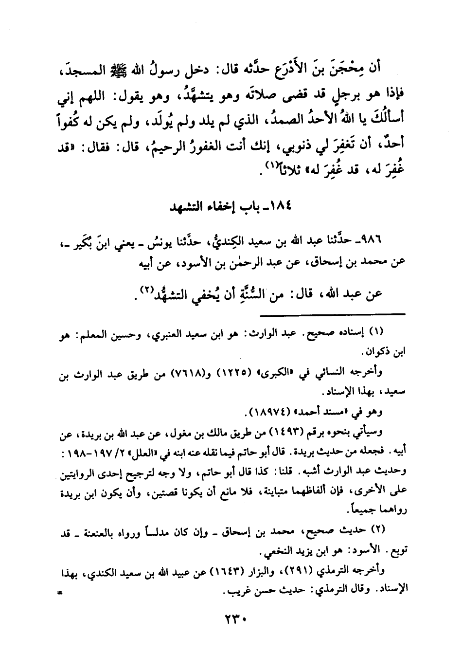 أن مِحْجَنَ بنَ الأَدرَع حدّثه قال: دخل رسولُ الله- صلى الله عليه وسلم -المسجدَ، فإذا هو برجلِ قد قضى صلاتَه وهو يتشهَّدُ، وهو يقول: اللهم إني أسألُكَ يا اللهُ الأحدُ الصمدُ، الذي لم يلد ولم يُولَد، ولم يكن له كُفواً أحدٌ، أن تَغفِرَ لي ذنوبي، إنك أنْت الغفورُ الرحيمُ، قال: فقال: "قد غُفِرَ له، قد غُفِرَ له " ثلاثاً (¬١).