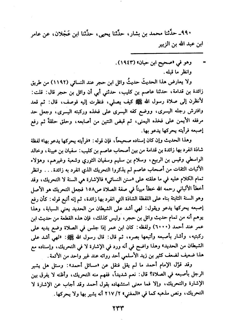 وهذا الحديث وإن كان إسناده صحيحاً، فإن قوله: "فرأيته يحركها يدعو بها" لفظة شاذة انفرد بها زائدة بن قدامة من بين أصحاب عاصم بن كليب: سفيان بن عيينة، وخالد الواسطي وقيس بن الربيع، وسلام بن سليم وسفيان الثوري وشعبة وغيرهم، وهؤلاء الأثبات الثقات من أصحاب عاصم لم يذكروا التحريك الذي انفرد به زائدة ... وانظر تمام الكلام عليه في ما علقته على "سنن النسائي" فالإشارة هي السنة لا التحريك، وقد أخطأ الألباني رحمه الله خطأ مبيناً في صفة الصلاة ص ١٥٨ فجعل التحريك هو الأصل وهو السنة الثابتة بناء على اللفظة الشاذة التي انفرد بها زائدة، ثم إنه أتبع قوله: كأن رفع إصبعه يحركها يدعو ويقول: لهي أشد على الشيطان من الحديد يعني السبابة، وهذا يوهم أنه من تمام حديث وائل بن حجر، وليس كذلك، فإن هذه القطعة من حديث ابن عمر عند أحمد (٦٠٠٠) ولفظه: كان ابن عمر إذا جلس فى الصلاة وضع يديه على ركبتيه، وأشار بأصبعه وأتبعها بصره، ثم قال: قال رسول الله- صلى الله عليه وسلم -: "لهي أشد على الشيطان من الحديد" وهذا واضح فى أنه ورد فى الإشارة لا فى التحريك، وإسناده مع هذا ضعيف لضعف كثير بن زيد الأسلمي أحد رواته عند غير واحد من الأئمة.