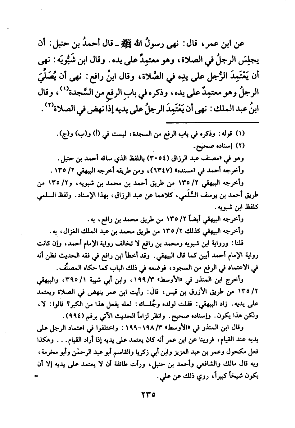 وأخرج ابن المنذر في "الأوسط" ٣/ ١٩٩، وابن أبي شيبة ١/ ٣٩٥، والبيهقي ٢/ ١٣٥ من طريق الأزرق بن قيس، قال: رأيت ابن عمر ينهض في الصلاة ويعتمد على يديه. زاد البيهقي: فقلت لولده وجُلسائه: لعله يفعل هذا من الكبر؟ قالوا: لا، ولكن هذا يكون. وإسناده صحيح. وانظر لزاماً الحديث الآتي برقم (٩٩٤).