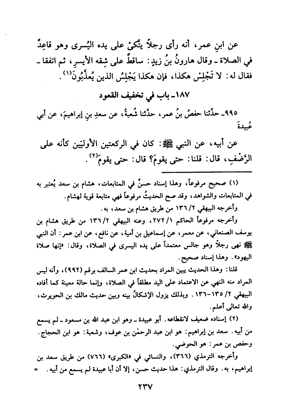 وأخرجه مرفوعاً الحاكم ١/ ٢٧٢، وعنه البيهقي ٢/ ١٣٦ من طريق هشام بن يوسف الصنعانى، عن معمر، عن إسماعيل بن أمية، عن نافع، عن ابن عمر: أن النبي - صلى الله عليه وسلم - نهى رجلاً وهو جالس معتمداً على يده اليسرى فى الصلاة، وقال: "إنها صلاة اليهود". وهذا إسناد صحيح.