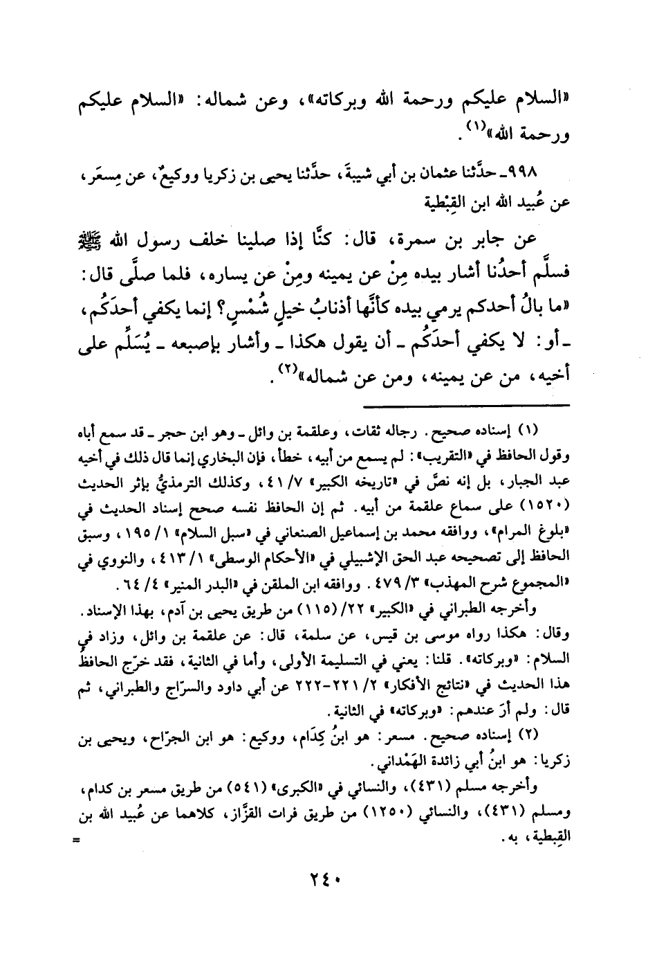 السلام: "وبركاته". قلنا: يعني في التسليمة الأولى، وأما في الثانية، فقد خرّج الحافظ هذا الحديث في "نتائج الأفكار" ٢/ ٢٢١ - ٢٢٢ عن أبي داود والسرّاج والطبراني، ثم قال: ولم أرَ عندهم: "وبركاته" في الثانية.