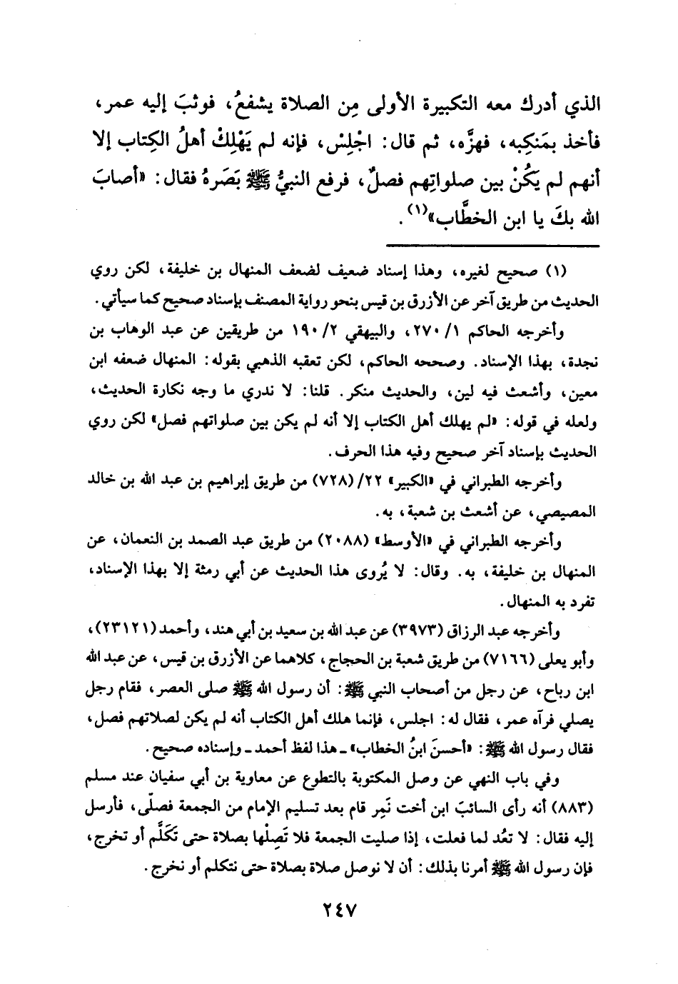 الذي أدرك معه التكبيرة الأولى مِن الصلاة يشفعُ، فوثبَ إليه عمر، فأخذ بمَنكِبه، فهزَّه، ثم قال: اجلِس، فإنه لم يَهلِك أهلُ الكِتاب إلا أنهم لم يكن بين صلواتِهم فصل، فرفع النبي- صلى الله عليه وسلم -بَصَرهُ فقال: "أصابَ الله بكَ يا ابن الخطاب" (¬١).