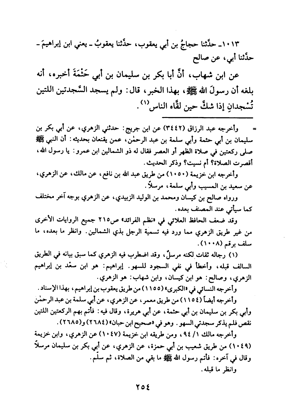(¬١) رجاله ثقات لكنه مرسل، وقد اضطرب فيه الزهري كما سبق بيانه في الطريق السالف قبله، وأخطأ في نفى السجود للسهو. إبراهيم: هو ابن سعْد بن إبراهيم الزهري، وصالح: هو ابن كيسان، وابن شهاب: هو الزهري.