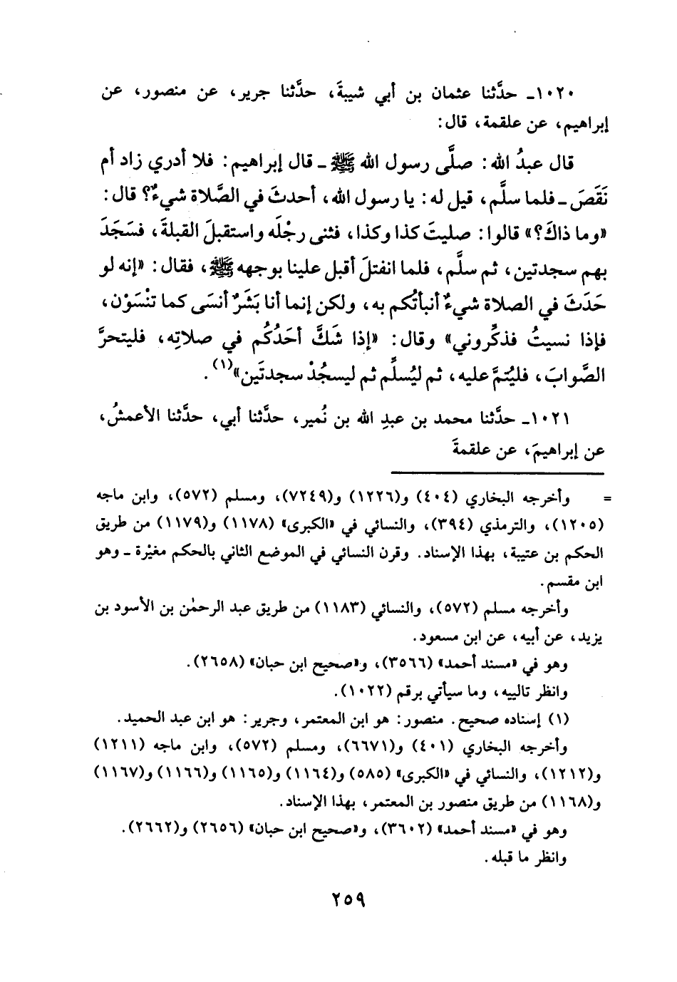 ١٠٢٠ - حدثنا عثمان بن أبي شيبةَ، حدثنا جرير، عن منصور، عن إبراهيم، عن علقمة، قال: