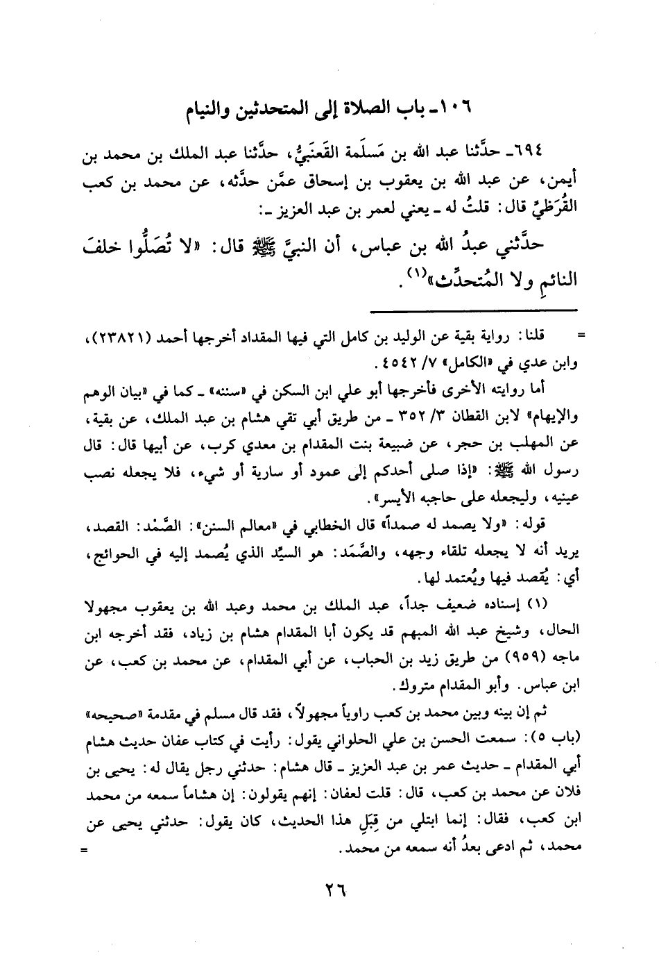 حدَّثني عبدُ الله بن عباس، أن النبى- صلى الله عليه وسلم- قال: "لا تُصَلُّوا خلفَ النائمِ ولا المُتحدّث" (¬١).