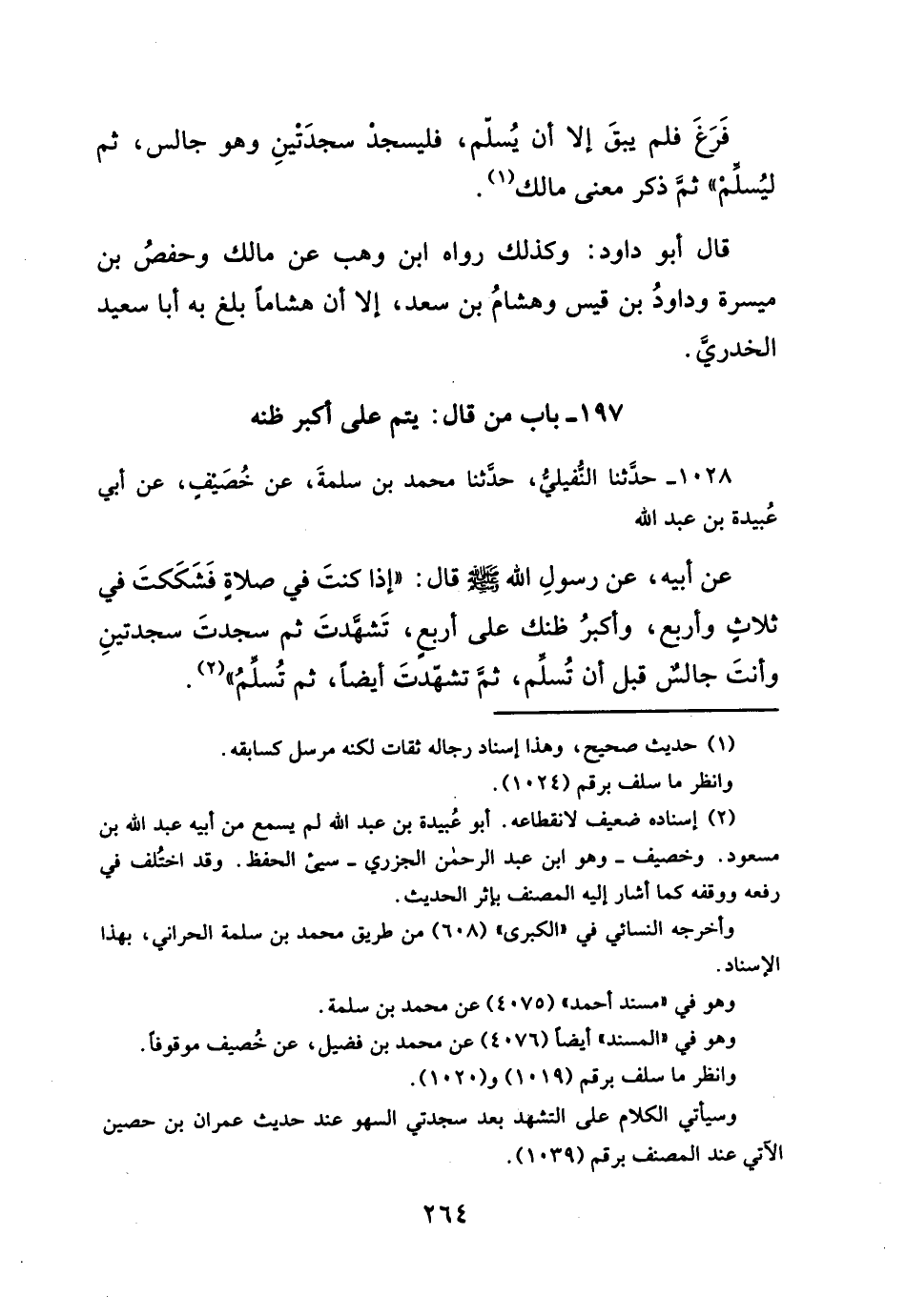 ١٠٢٨ - حدَثنا النُّفيليُّ، حدثنا محمد بن سلمةَ، عن خُصَيف، عن أبي عُبيدة بن عبد الله عن أبيه، عن رسولِ الله- صلى الله عليه وسلم -قال: "إذا كنتَ في صلاةٍ فَشَكَكتَ في ثلاثٍ وأربع، وأكبرُ ظنك على أربعٍ، تَشهدتَ ثم سجدتَ سجدتينِ وأنتَ جالسٌ قبل أن تُسلّم، ثمَ تشهّدتَ أيضاً، ثم تُسلّمُ" (¬٢).