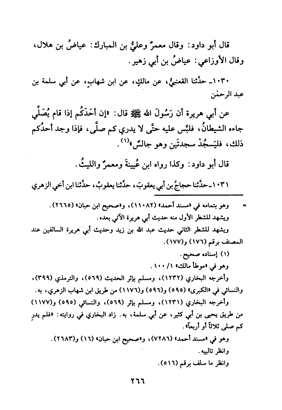 ١٠٣٠ - حدَّثنا القعنبي، عن مالكٍ، عن ابن شهاب، عن أبي سلمة بن عبد الرحمن عن أبي هريرة أن رَسُولَ الله- صلى الله عليه وسلم -قال: "إن أحَدَكم إذا قام يُصَلّي جاءه الشيطانُ، فلبَّس عليه حتَى لا يدري كم صلّى، فإذا وجد أحدُكم ذلك، فليَسجُد سجدتَين وهو جالسٌ" (¬١).