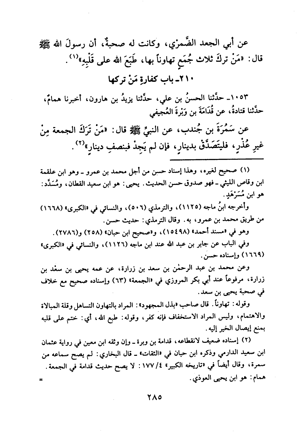 عن أبي الجعد الضّمري، وكانت له صحبةٌ، أن رسولَ الله- صلَّى الله عليه وسلم - قال: "مَنْ تركَ ثلاث جُمَعٍ تهاوناً بها، طَبَعَ الله على قَلْبِهِ" (¬١).