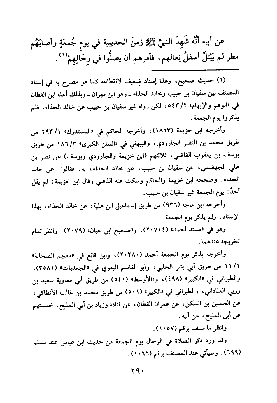 وأخرجه ابن خزيمة (١٨٦٣)، وأخرجه الحاكم في "المستدرك" ١/ ٢٩٣ من طريق محمد بن النضر الجارودي، والبيهقي في "السنن الكبرى" ٣/ ١٨٦ من طريق يوسف بن يعقوب القاضى، ثلاثتهم (ابن خزيمة والجارودي ويوسف) عن نصر بن علي الجهضمي، عن سفيان بن حبيب، عن خالد الحذاء، به. فقالوا: عن خالد الحذاء. وصححه ابن خزيمة والحاكم وسكت عنه الذهبي وقال ابن خزيمة: لم يقل أحد: يوم الجمعة غير سفيان بن حبيب.