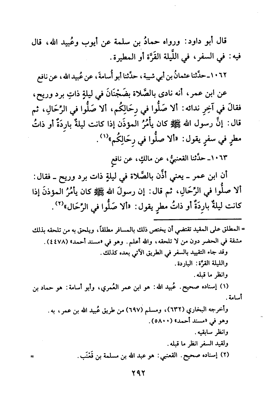 ١٠٦٢ - حدثنا عثمانُ بن أبى شيبة، حدثنا أبو أُسامةَ، عن عُبيد الله، عن نافع عن ابن عمر، أنه نادى بالصلاة بضَجنَانَ في ليلةِ ذاتِ برد وريح، فقالَ في آخِرِ ندائه: ألا صَلُّوا في رِحَالِكُم، ألا صَلُّوا في الرِّحَالِ، ثم قال: إن رسول الله- صلَّى الله عليه وسلم -كان يأمُرُ المؤذَن إذا كانت ليلة بارِدَة أو ذاتُ مطرٍ في سفرٍ يقول: "ألا صلُوا في رِحَالِكُم" (¬١).