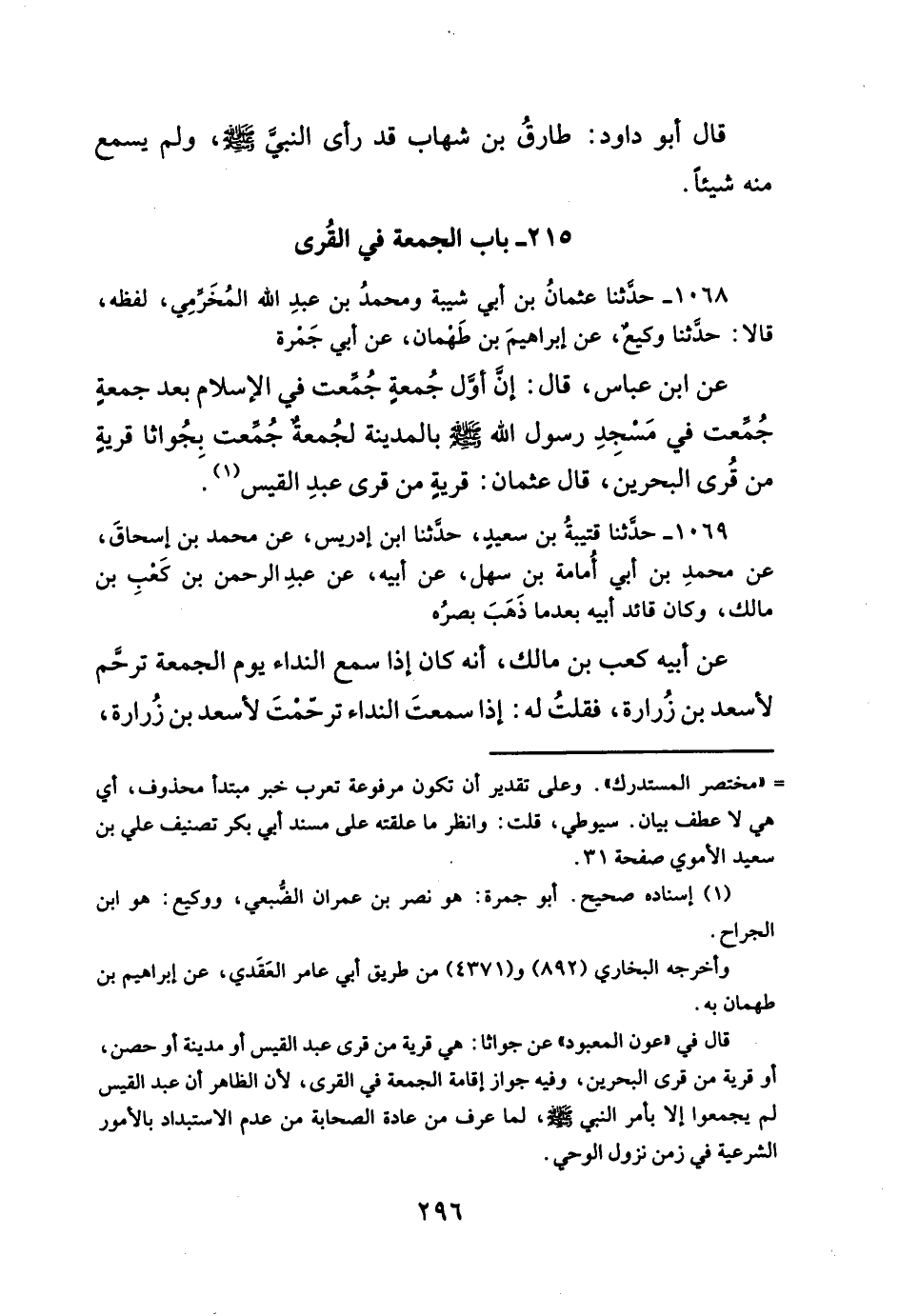 عن ابن عباس، قال: إنَ أوَل جُمعةِ جُمِّعت في الإسلام بعد جمعةِ جُمِّعت في مَسجِدِ رسول الله - صلَّى الله عليه وسلم -بالمدينة لجُمعة جُمّعت بِجُواثا قريةٍ من قُرى البحرين، قال عثمان: قريةِ من قرى عبدِ القيس (¬١).