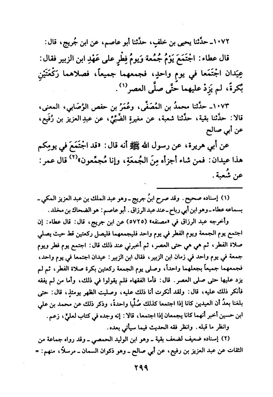 ١٠٧٢ - حدثنا يحيى بن خلفِ، حدثنا أبو عاصم، عن ابن جُريج، قال: قال عطاء: اجتَمَعَ يَومُ جُمُعة وَيومُ فِطْرِ على عَهْدِ ابن الزبير فقال: عِيَدان اجتَمَعا في يومِ واحدِ، فجمعهما جميعاً، فصلاهما رَكعَتَينِ بكرةَ، لم يَزِد عليهما حتى صلَّى العصر (¬١).