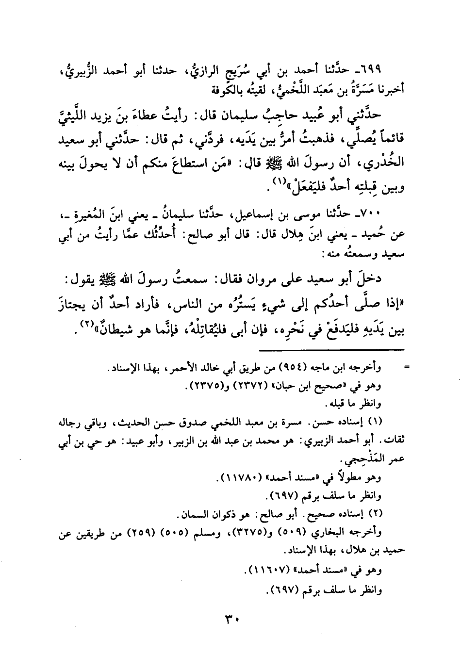 ٧٠٠ - حدَثنا موسى بن إسماعيل، حدثنا سليمانُ- يعني ابنَ المُغيرةِ-، عن حُميد- يعني ابنَ هِلال قال: قال أبو صالح: أُحدِّثُك عمَّا رأيتُ من أبي سعيد وسمعتُه منه: دخلَ أبو سعيد على مروان فقال: سمعتُ رسولَ الله - صلى الله عليه وسلم -يقول: "إذا صلَّى أحدُكم إلى شيءِ يَستُرُه من الناس، فأراد أحدٌ أن يجتازَ بين يَدَيهِ فليَدفَعْ في نَحْرِه، فإن أبى فليُقاتِلْهُ، فإنما هو شيطانٌ " (¬٢).