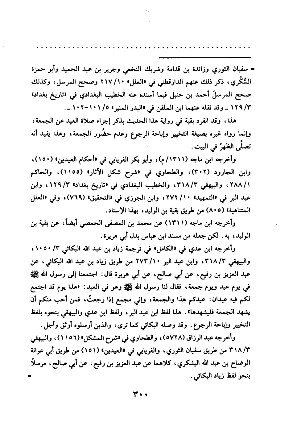 = سفيان الثوري وزائدة بن قدامة وشريك النخعى وجرير بن عبد الحميد وأبو حمزة السُّكَّري، ذكر ذلك عنهم الدارقطني في "العلل" ١٠/ ٢١٧ وصحح المرسل، وكذلك صحح المرسلَ أحمد بن حنبل فيما أسنده عنه الخطيب البغدادي في "تاريخ بغداد" ٣/ ١٢٩ - وقد نقله عنهما ابن الملقن في" البدر المنير"٥/ ١٠١ - ١٠٢ - . هذا، وقد انفرد بقية في رواية هذا الحديث بذكر إجزاء صلاة العيد عن الجمعة، وإنما رواه غيره بصيغة التخيير وإباحة الرجوع وعدم حضُور الجمعة، وهذا يفيد أنه تصلى الظهرُ في البيت.
